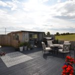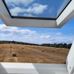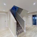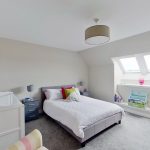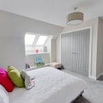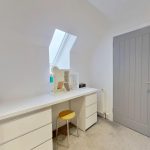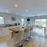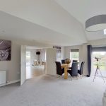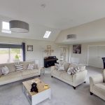 Double doors lead through to an impressive vaulted-ceiling lounge, filled with natural light from two sets of patio doors, full-height fixed windows, and four Velux windows. A striking chimney breast clad in natural stone-effect split face tiles houses a sleek Gazco glass-fronted balanced flue gas fire, creating a warm and inviting focal point. The lounge also offers plenty of space for a second dining area.