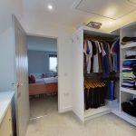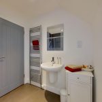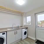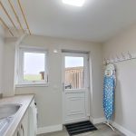 Completing the ground floor is a convenient utility room with external access to an accessible ramp. The utility room includes a washing machine, tumble dryer, stainless steel sink with storage below, coat hanging space, and a traditional ceiling-mounted clothes pulley.