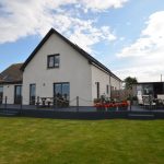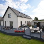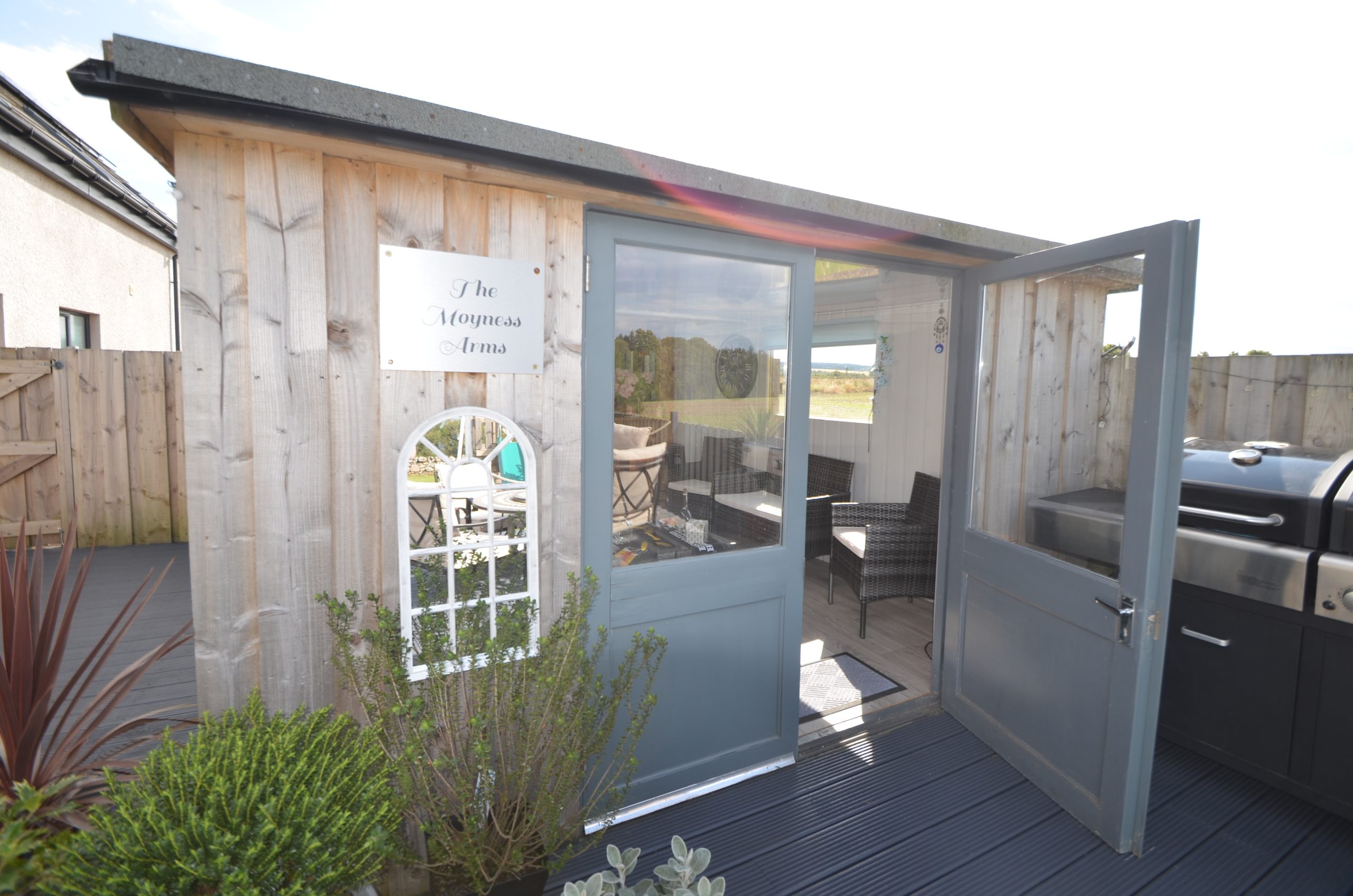 A gravelled driveway to the front provides ample parking and leads to the integral garage. The garden includes a large Douglas fir-clad shed, lawned areas, and a side space currently home to chickens, complete with coop and run. To the rear, a generous lawn, summer house/home bar (The Moyness Arms), and large raised decking area offer the perfect space to relax and take in the sea views.