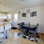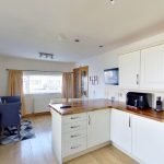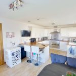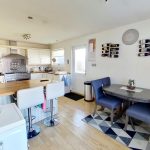 The generous front-facing lounge is carpeted and features double doors leading through to the bright dining kitchen, fitted with attractive cream wall and base units complemented by solid oak worktops and a cream tiled splashback. A Technik range cooker with five gas burners, two ovens, and an extractor hood is included, along with integrated appliances - washing machine, dishwasher, fridge, and freezer. Oak flooring runs throughout, and a stainless steel sink sits beneath a high-level window. This dual-aspect room offers space for a dining table, and includes a breakfast bar for more informal dining. A side door provides access to the garden.
