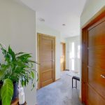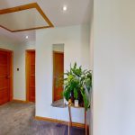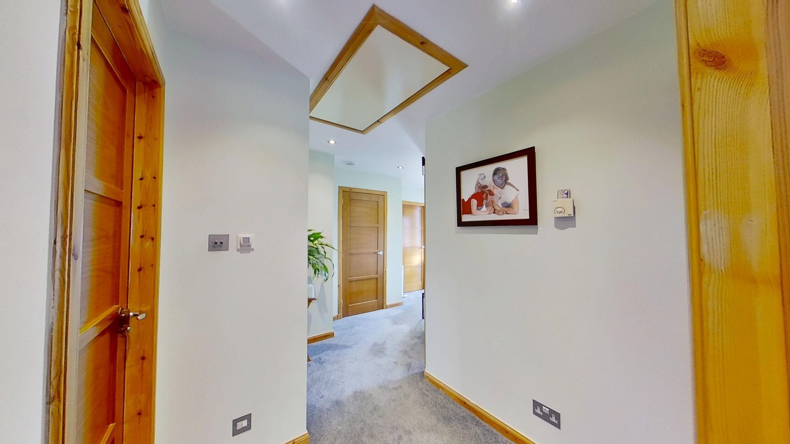 The double-glazed UPVC front door with side screen opens into a welcoming, carpeted hall with a cupboard for coats and shoes, a loft hatch with a Ramsay-style ladder giving access to a partially floored loft, and a feature mirrored radiator.