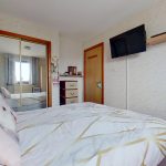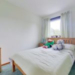 An ample double bedroom with carpet and a window looking out to the front garden. Double built-in wardrobe with sliding mirror doors, hanging rail and shelves. Curtain pole, curtains, carpet.