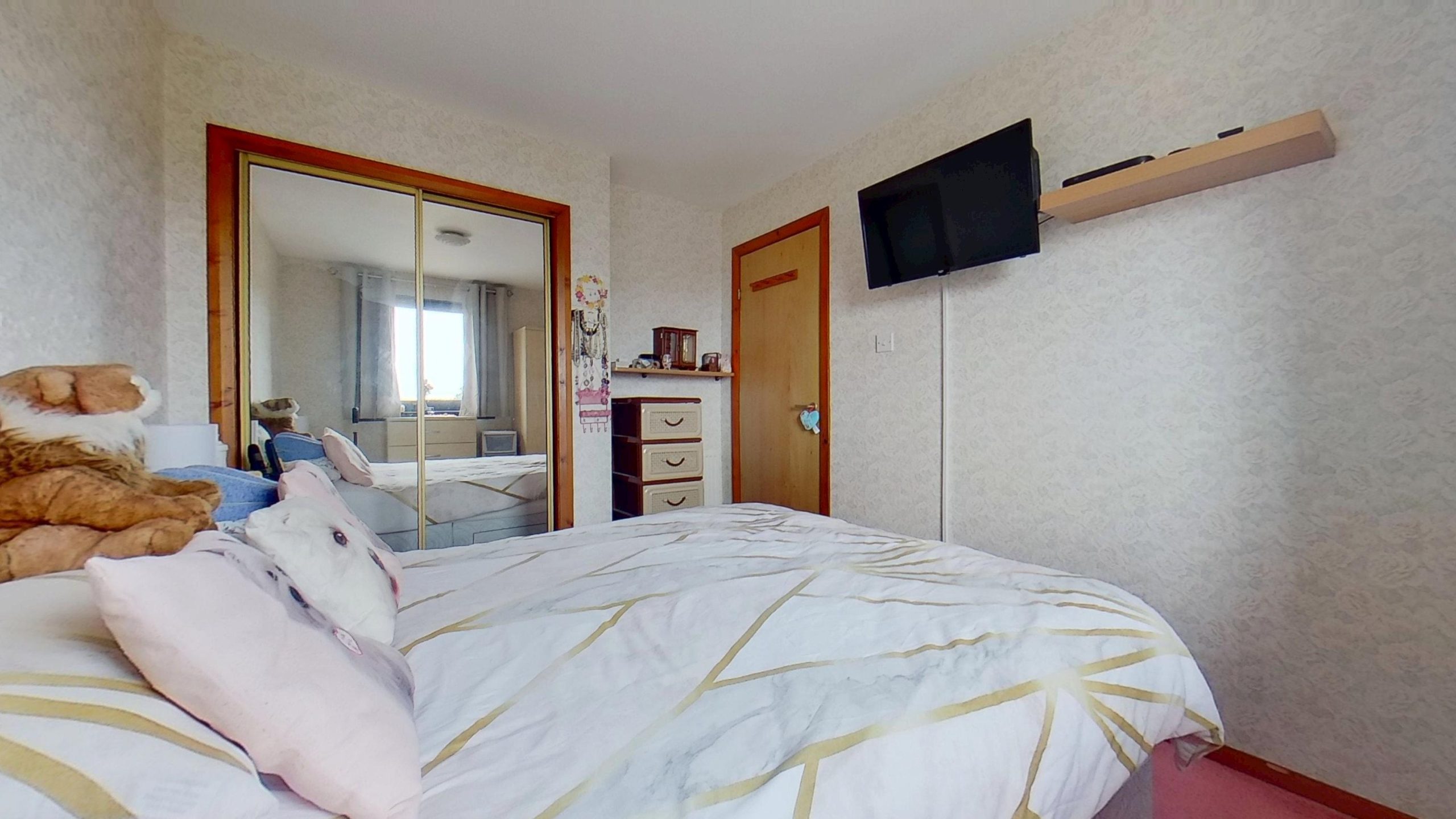 A double bedroom with a window looking out to the rear garden. Double built-in wardrobe with sliding mirror doors, hanging rail and shelves. Curtain rail, curtains, carpet.
