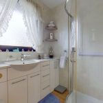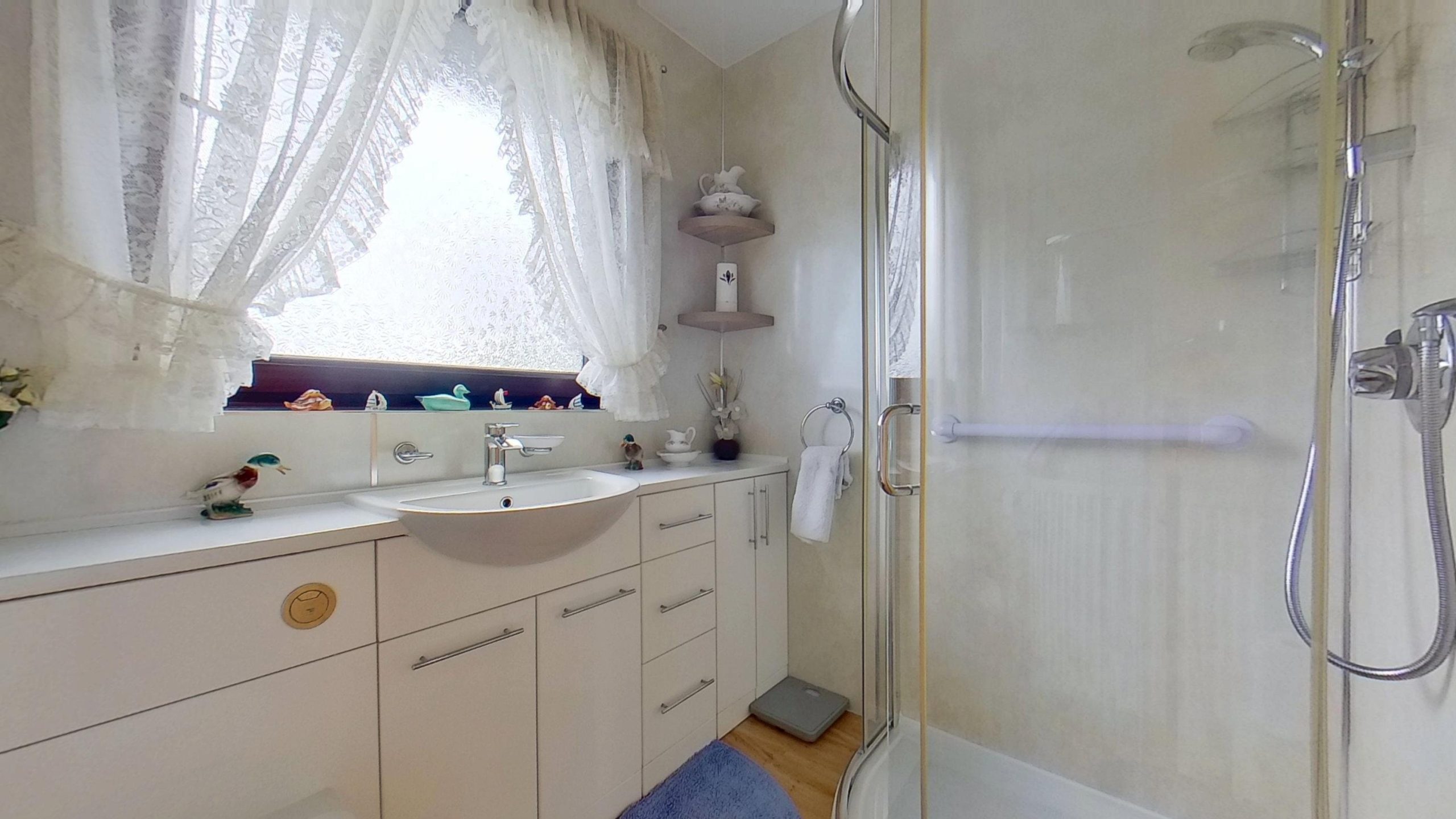 The shower room contains a 2-piece white suite comprising WC with a grabrail and a wash basin inset to convenient bathroom cabinets. Separate corner shower enclosure houses a mains shower and grab rail. Wall-mounted medicine cabinet with mirror doors. An opaque window looks to the rear of the house, providing ventilation and natural light. All shower room walls are fitted with wet-wall material. Curtains, curtain pole, wood-effect laminate flooring.