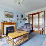 A welcoming living room with a large window looking out to the pretty front garden. A feature fireplace with tiled hearth and wooden mantlepiece houses an electric coal-effect fire, providing a cosy focal point. Wall-mounted wooden shelves and display cabinets. The handy understairs cupboard containing the electrical consumer unit, is fitted with a hanging rail and shelves, perfect for storage. Wooden door with glazed panel and glazed side screens leads into the dining room. Curtain pole, curtains, vertical blinds, carpet.