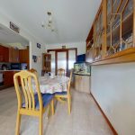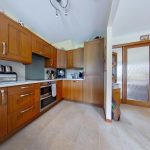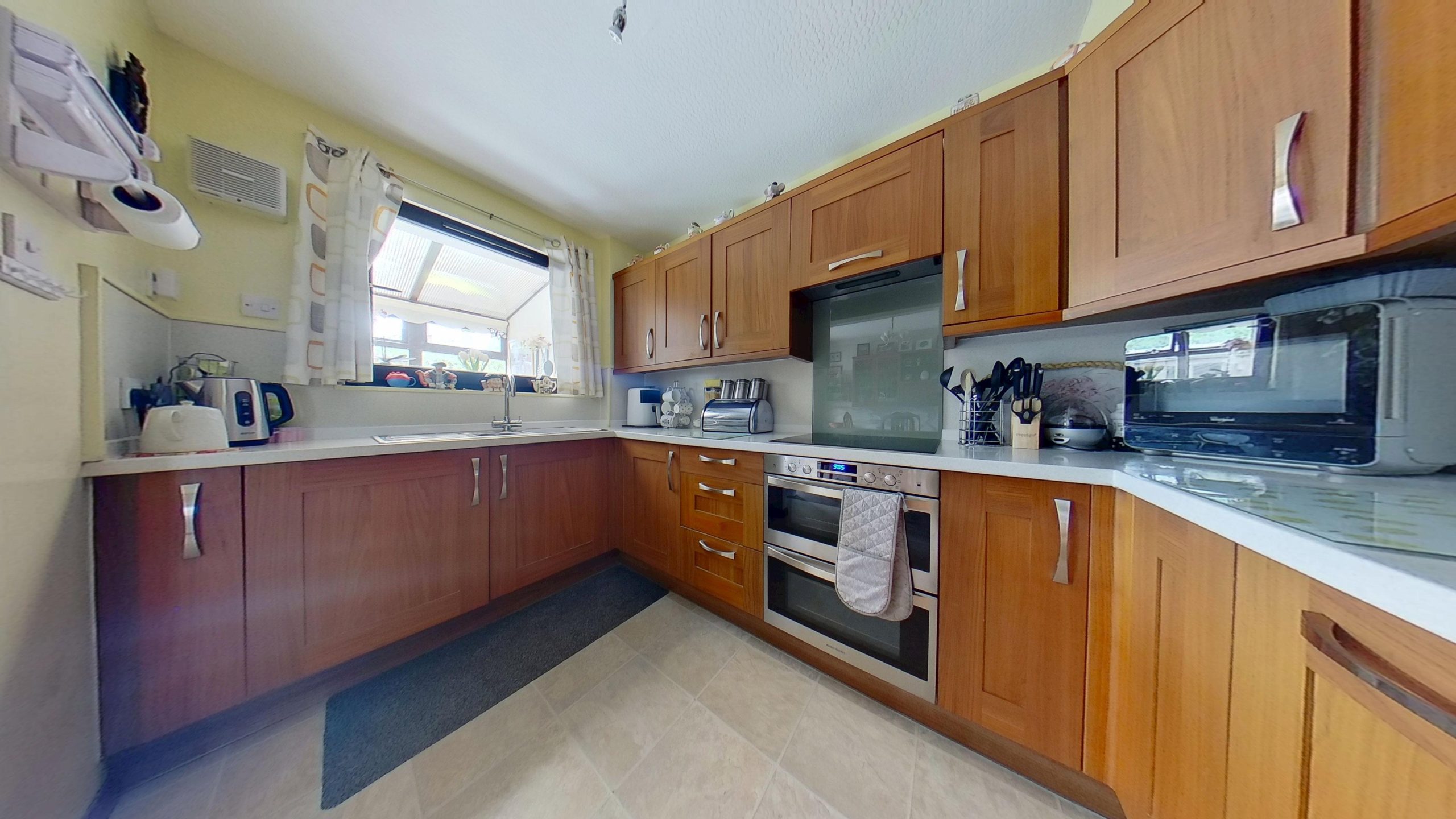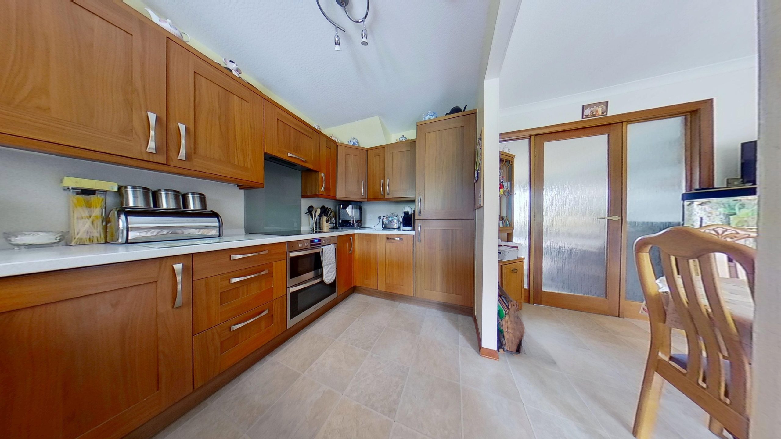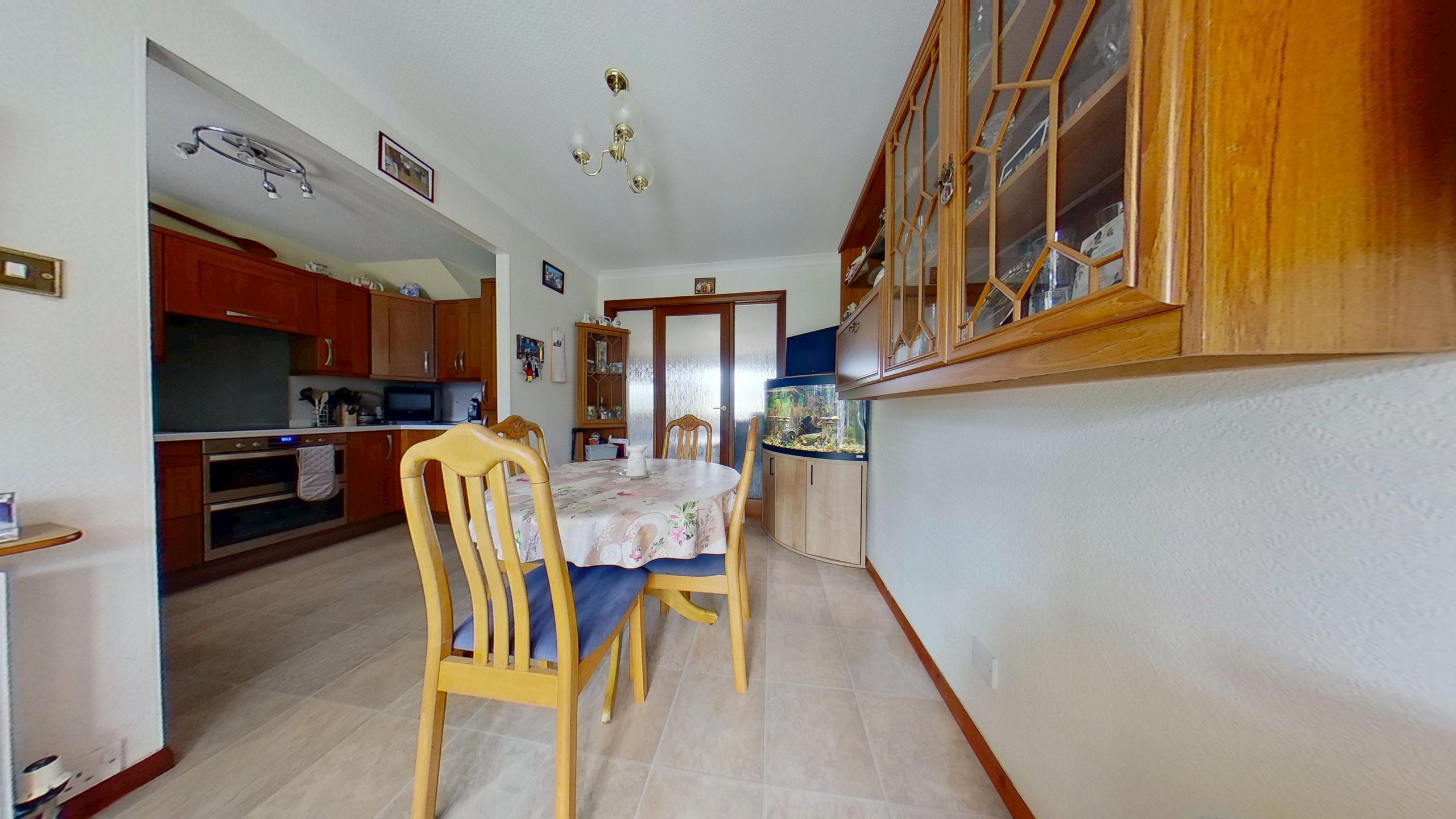 The dining area has plenty of space for table seating 4 and has tile-effect vinyl flooring which continues into the kitchen. There are further wall-mounted wooden shelves with display cabinets. From the dining room, sliding patio doors lead into the conservatory.