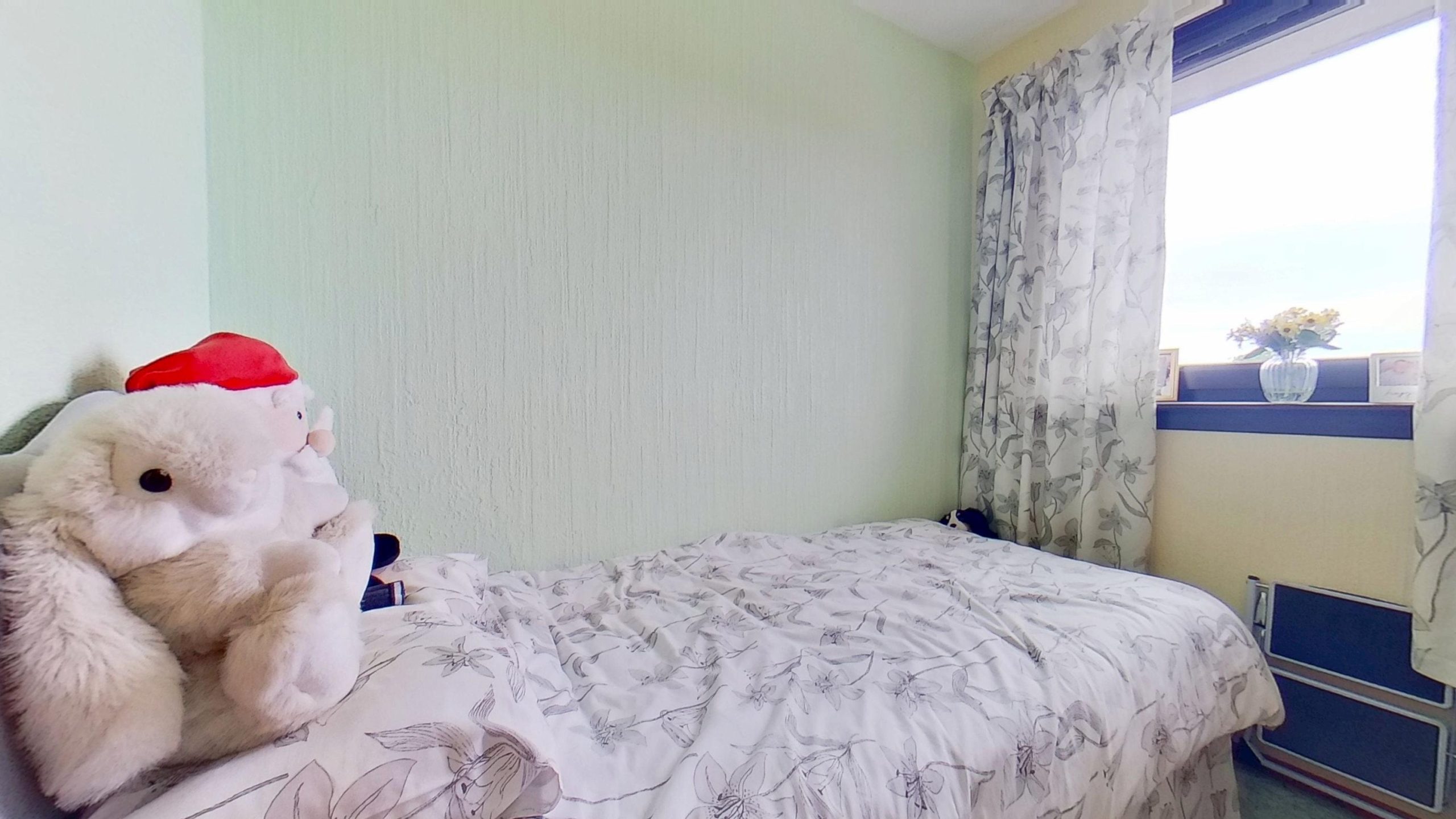 A single bedroom with a front-facing window. Curtain rail, curtains, carpet.