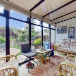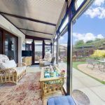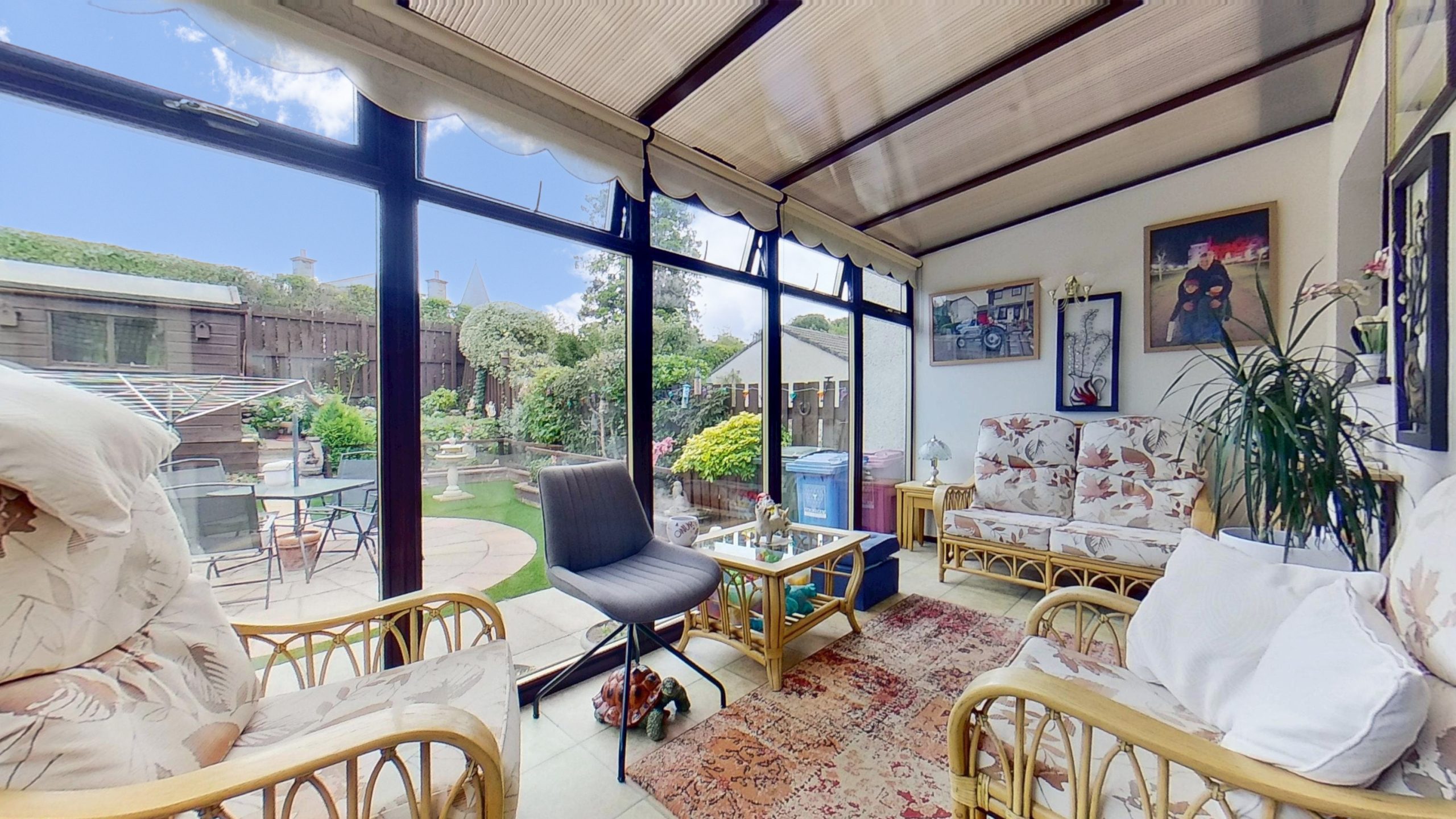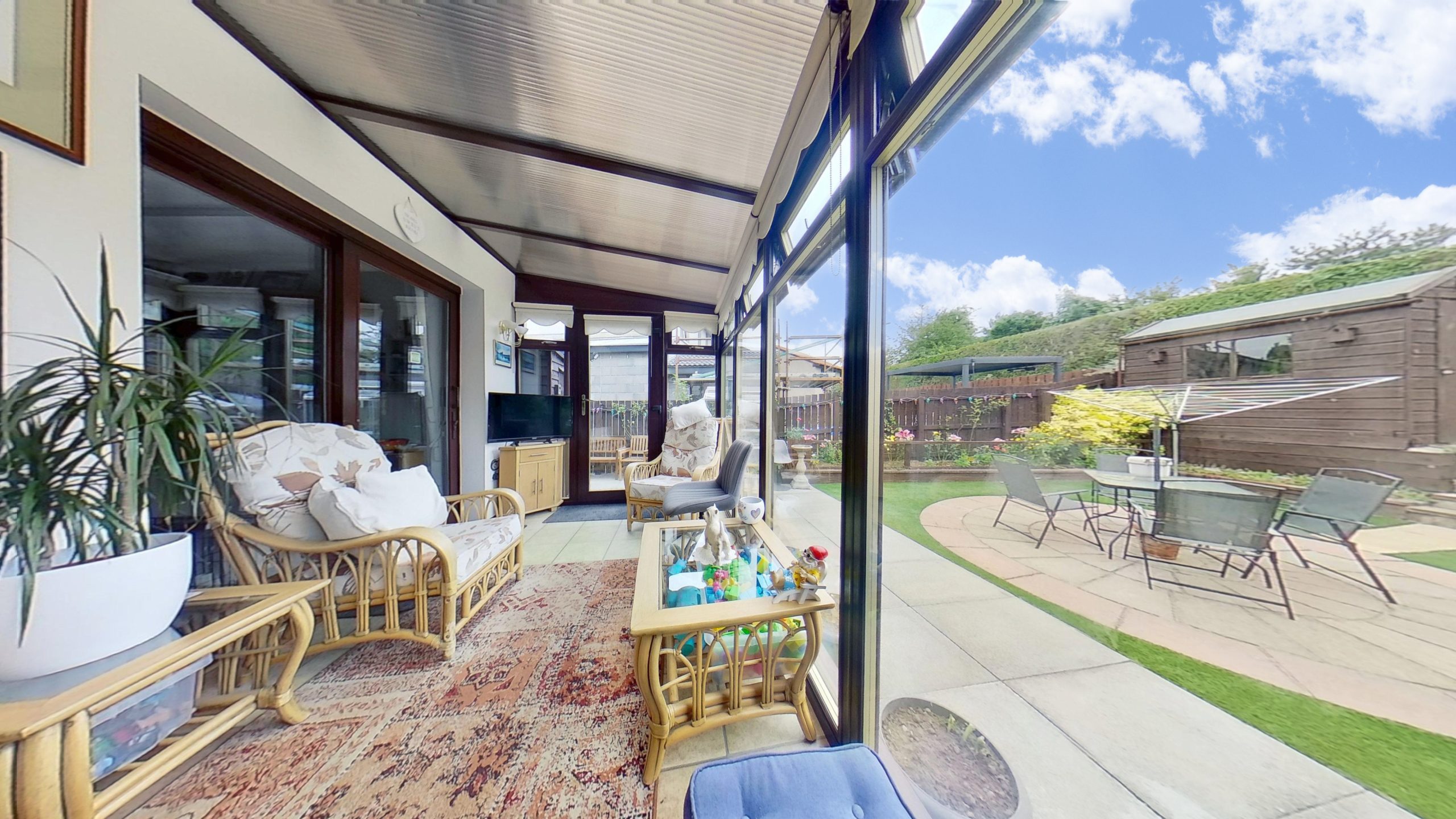 The lovely, bright, conservatory has windows spanning the length of the wall facing out to the rear garden and has a further window looking into the kitchen. An external door leads out to the garden, and all windows and door are fitted with roller blinds. The roof of the conservatory is polycarbonate. Tile-effect vinyl flooring.