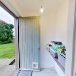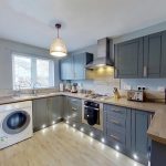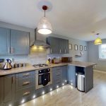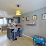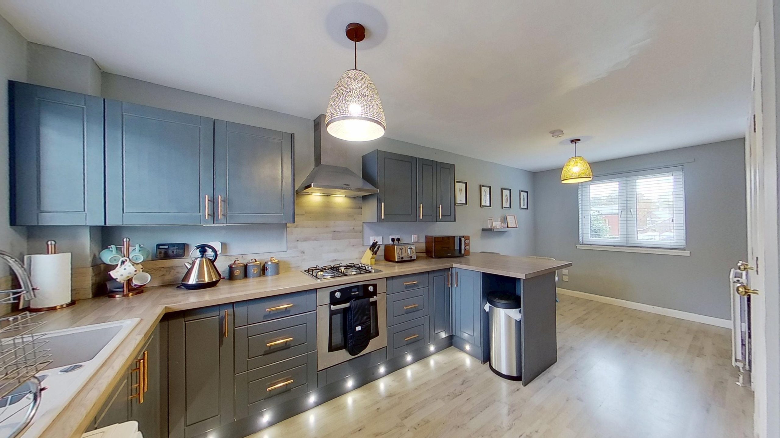 Adjacent to the lounge is a stylish dual aspect dining kitchen fitted with attractive grey wall and base units enhanced by contemporary copper-effect ironmongery, and coordinating worktops and upstands. Plinth lighting adds a modern touch, while the 1½ bowl light grey composite sink sits beneath a window allowing natural light in. The kitchen includes an oven, hob, extractor hood, and space for a fridge freezer, tumble dryer, and washing machine. A breakfast bar offers casual dining options alongside room for a table and chairs. Two full-height cupboards provide superb storage, and a rear vestibule leads directly to the garden.