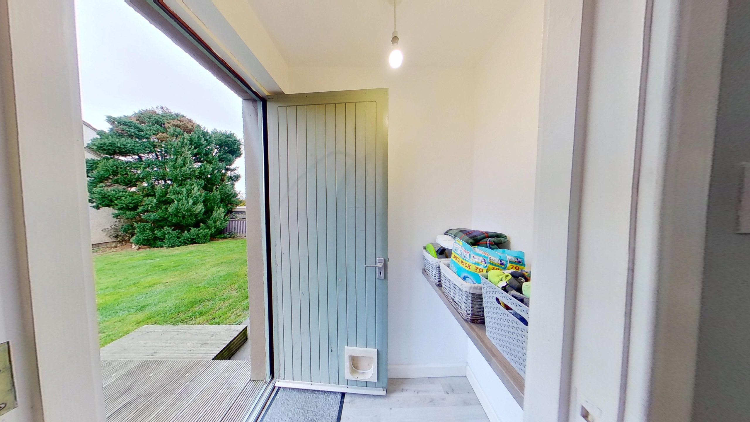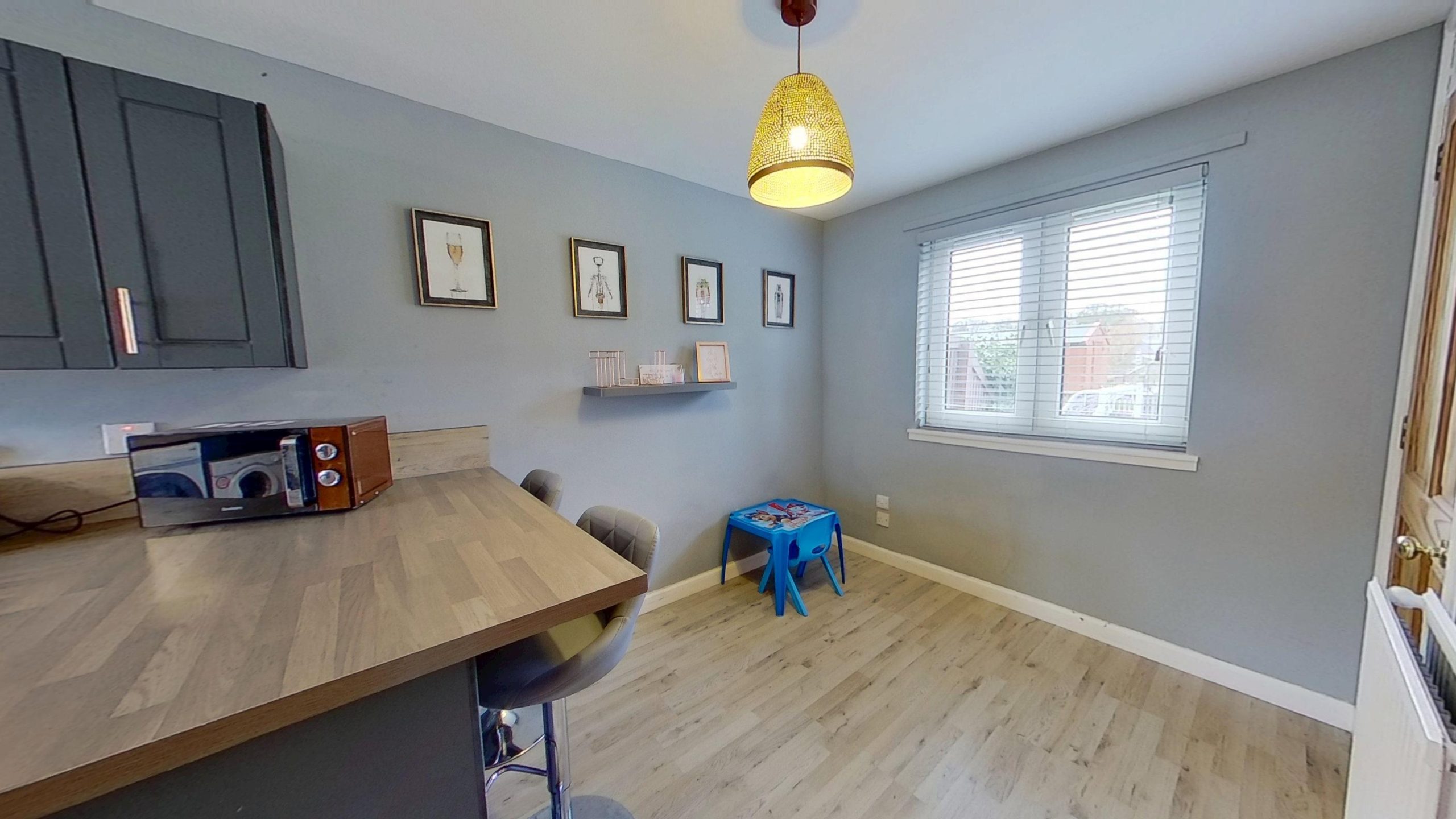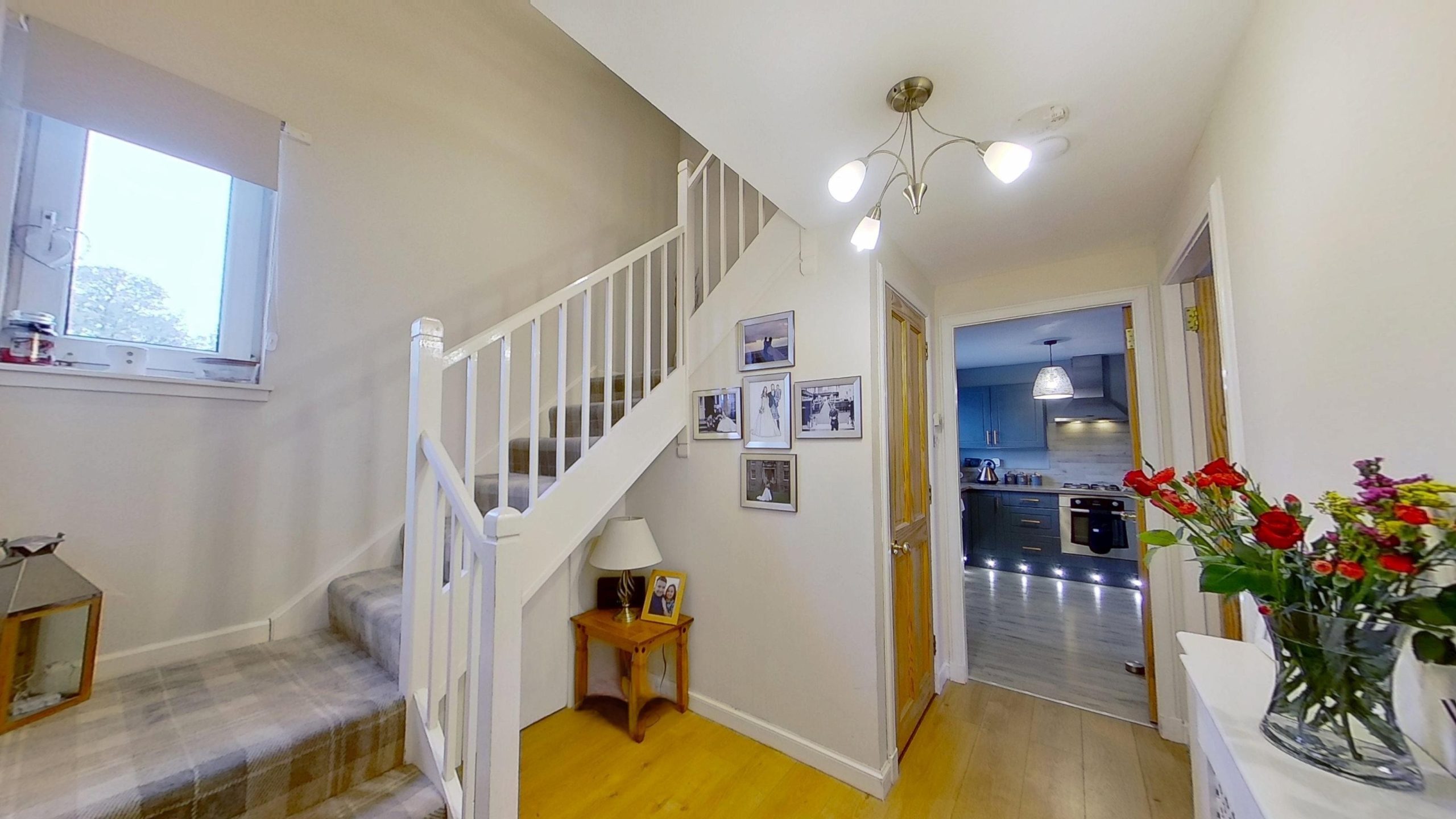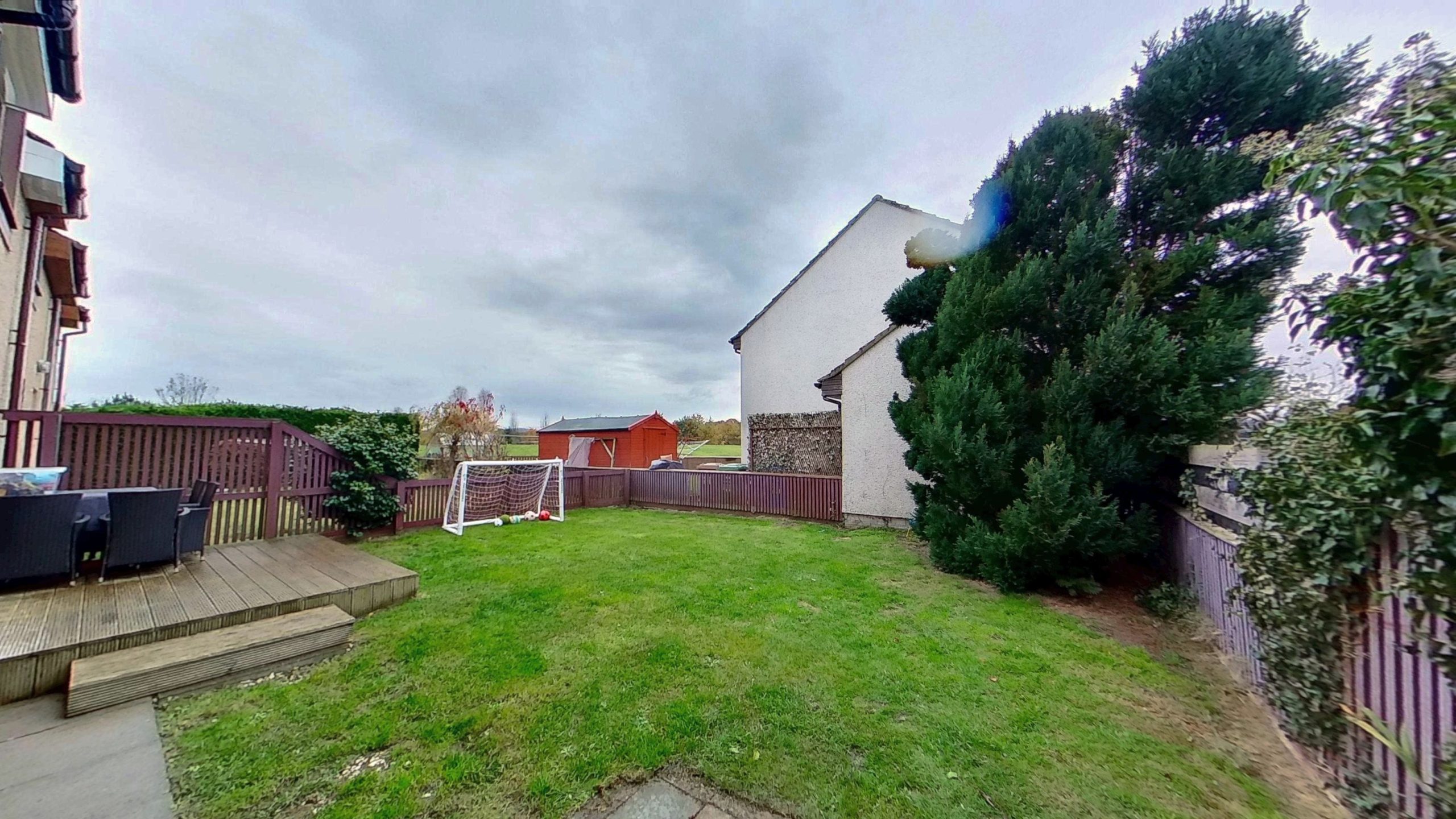 Situated in the popular village of Auldearn, just two miles from the charming seaside town of Nairn, this well-presented two-bedroom semi-detached home offers a host of benefits, and appeal for first-time buyers. Externally, the property boasts ample communal parking and a fully enclosed rear garden with a lawn and a decked area. Two full-height external stores provide excellent outdoor storage for garden furniture, outdoor toys and bikes.Step through the timber front door into a spacious hallway with wood-effect laminate flooring and a carpeted staircase leading to the first floor. A large walk-in cupboard offers convenient space for coats, shoes, and everyday items, and houses the electric circuit unit.