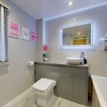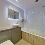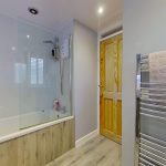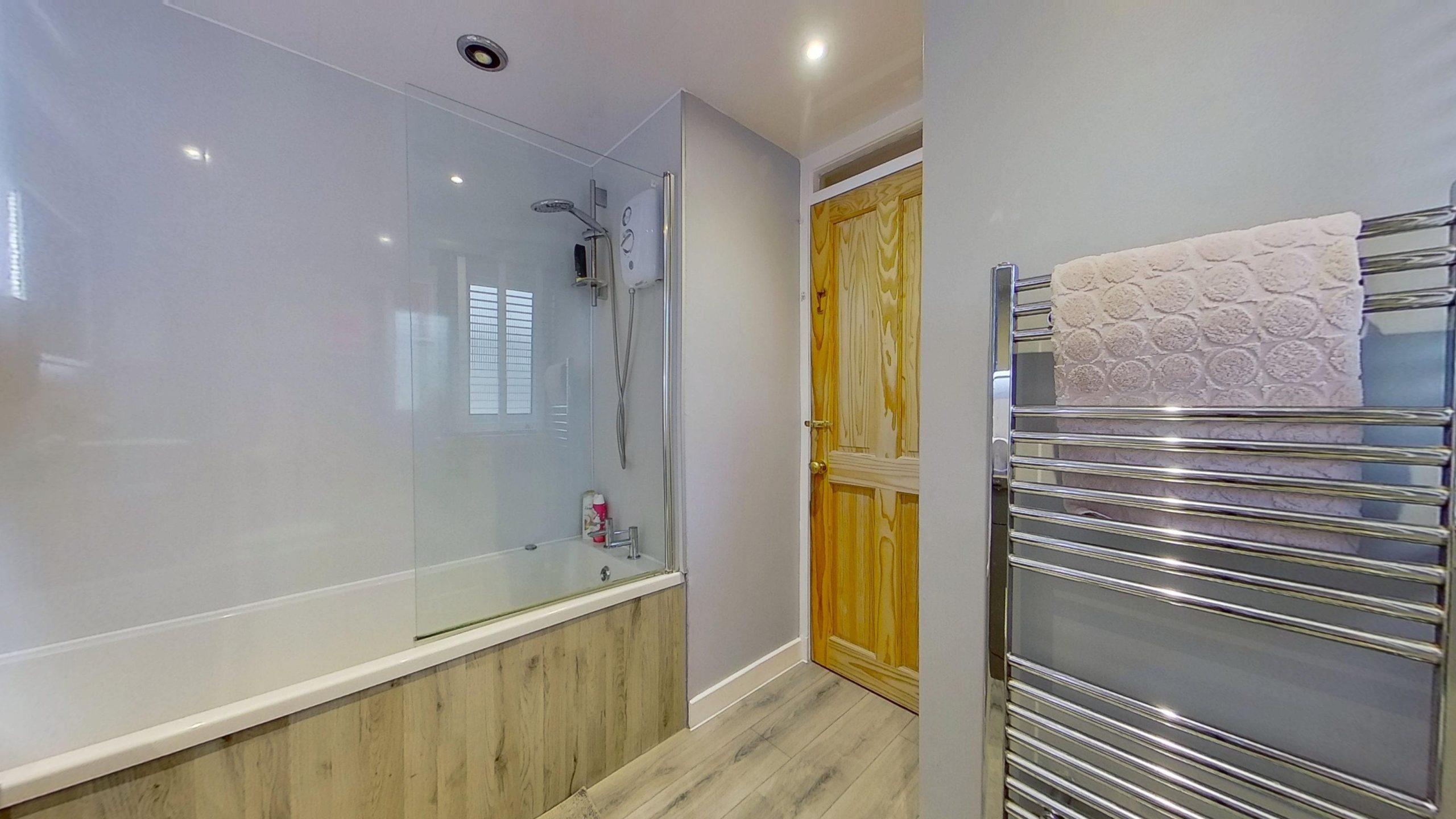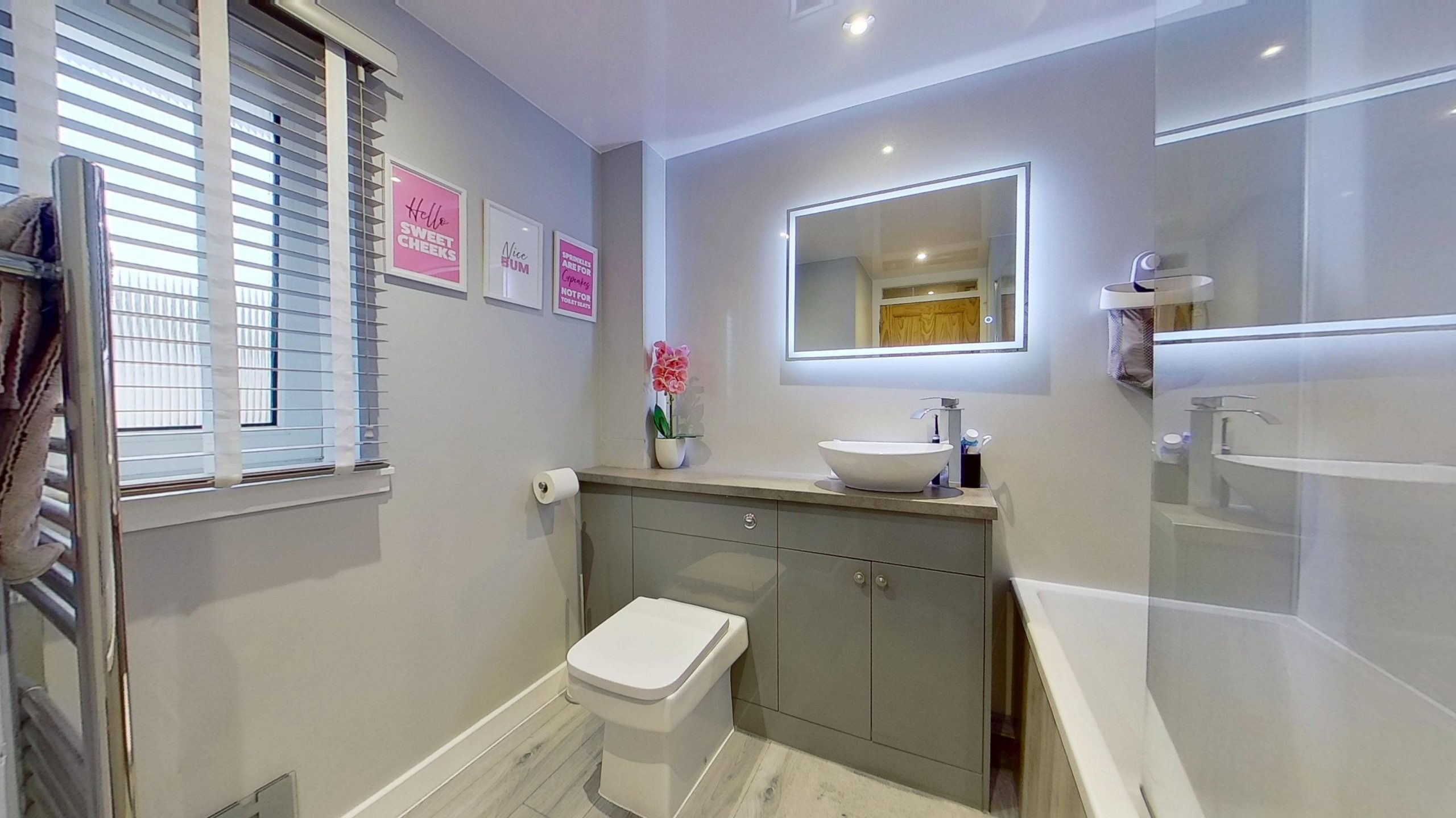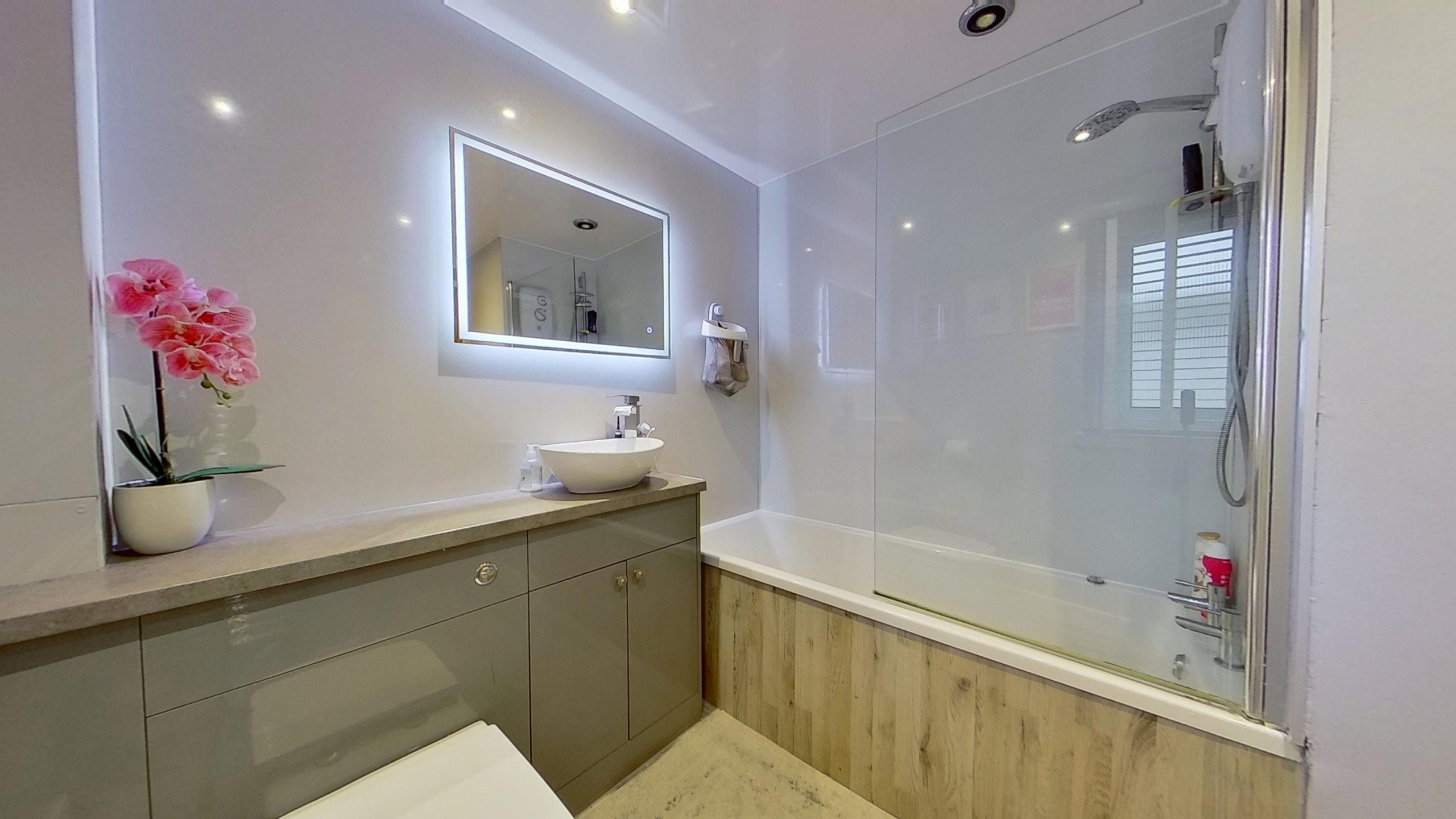The beautifully refurbished bathroom is modern and well-appointed, featuring an integrated WC and countertop basin with storage below and an illuminated mirror above, a bath with electric shower over, and a chrome ladder-style towel rail completes the contemporary look.