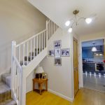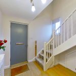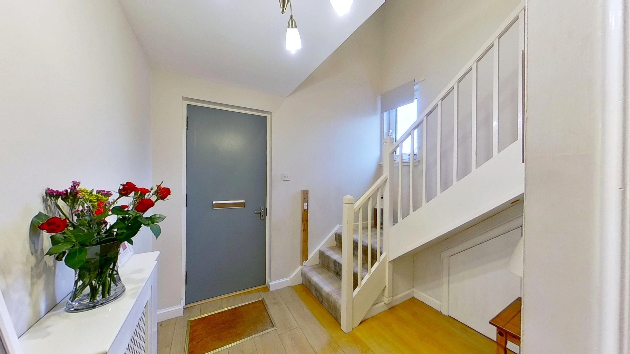 A carpeted staircase leading to the first floor features a window halfway up, bringing in additional light. The landing gives access to the loft and two further storage cupboards, one of which houses the central heating boiler.