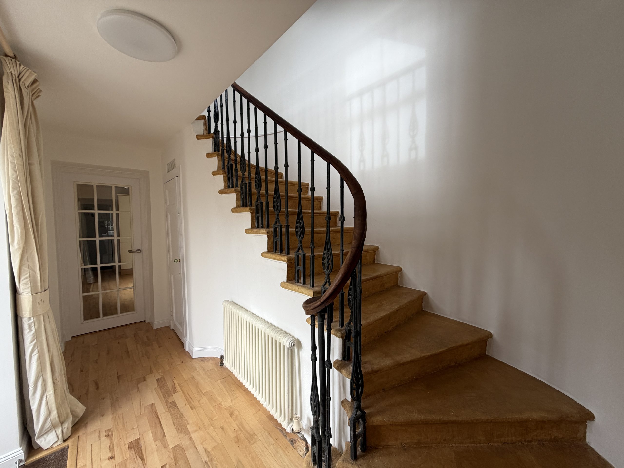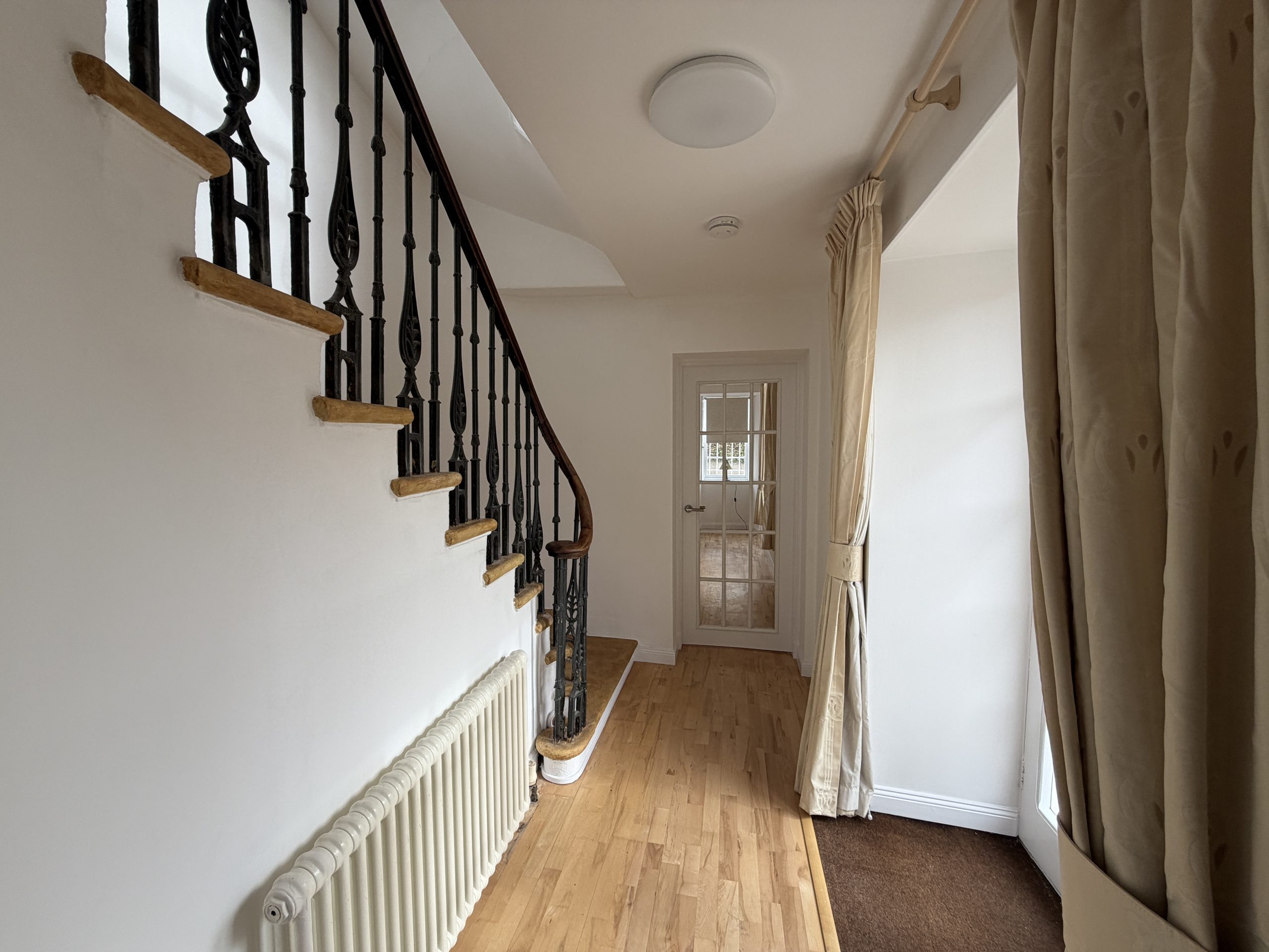 Entry to this lovely property is through glazed French doors into the welcoming hallway, where a stand-out feature is the original curved staircase with ornate metal balustrades and sweeping wooden handrail. The sash and case windows throughout the house and the attractive, vintage, cast iron fireplaces add further ambience and charm.