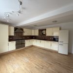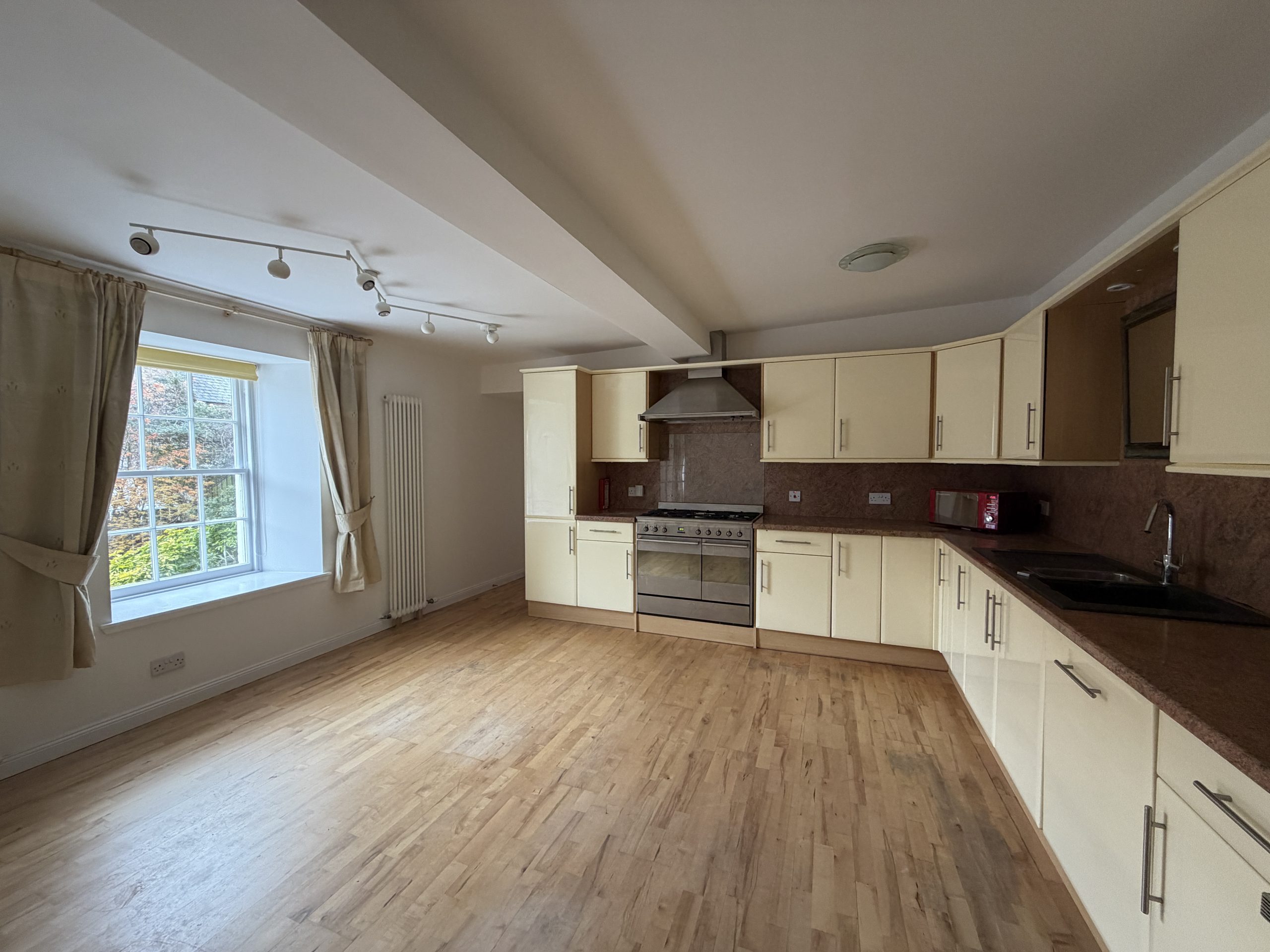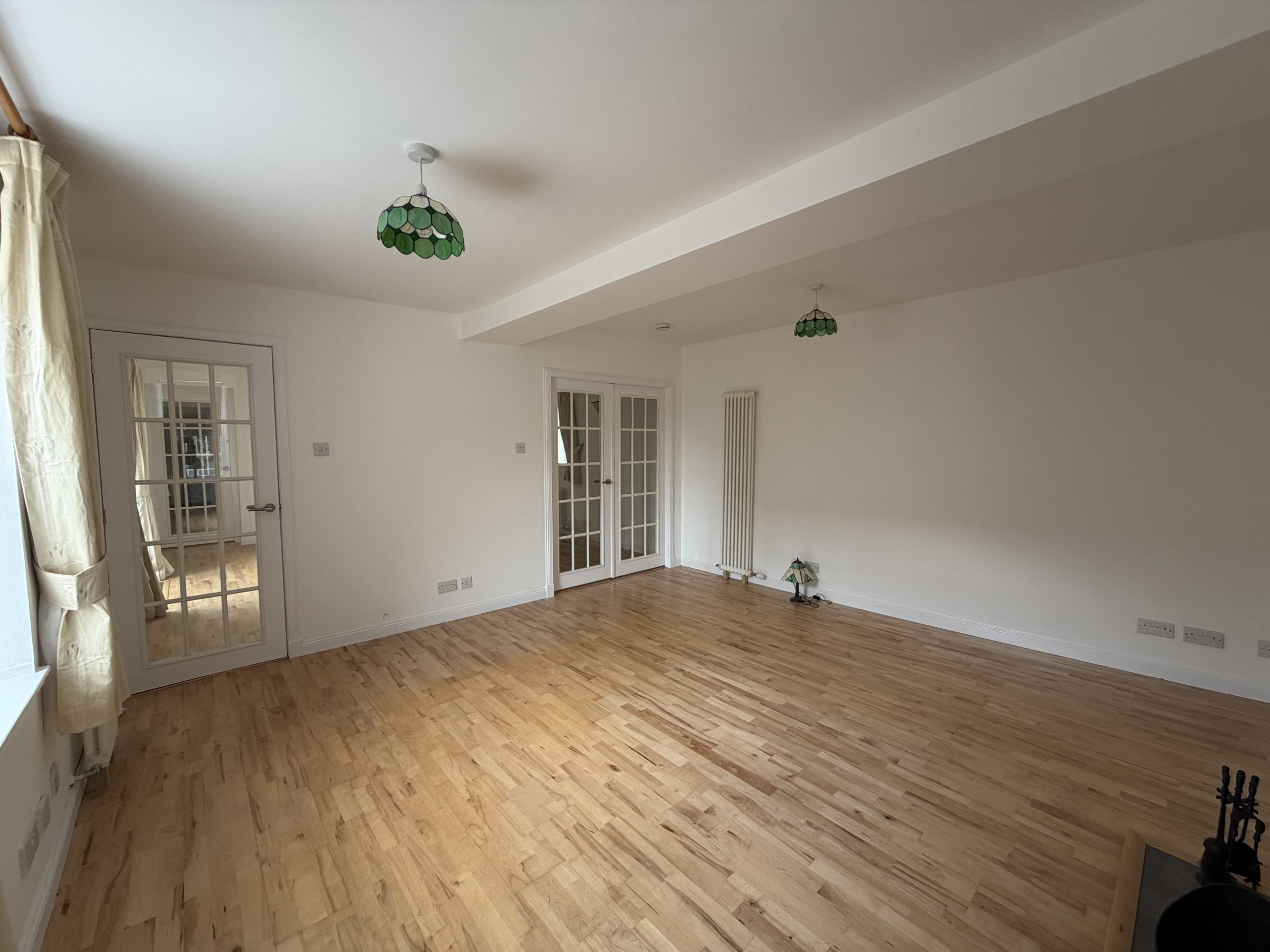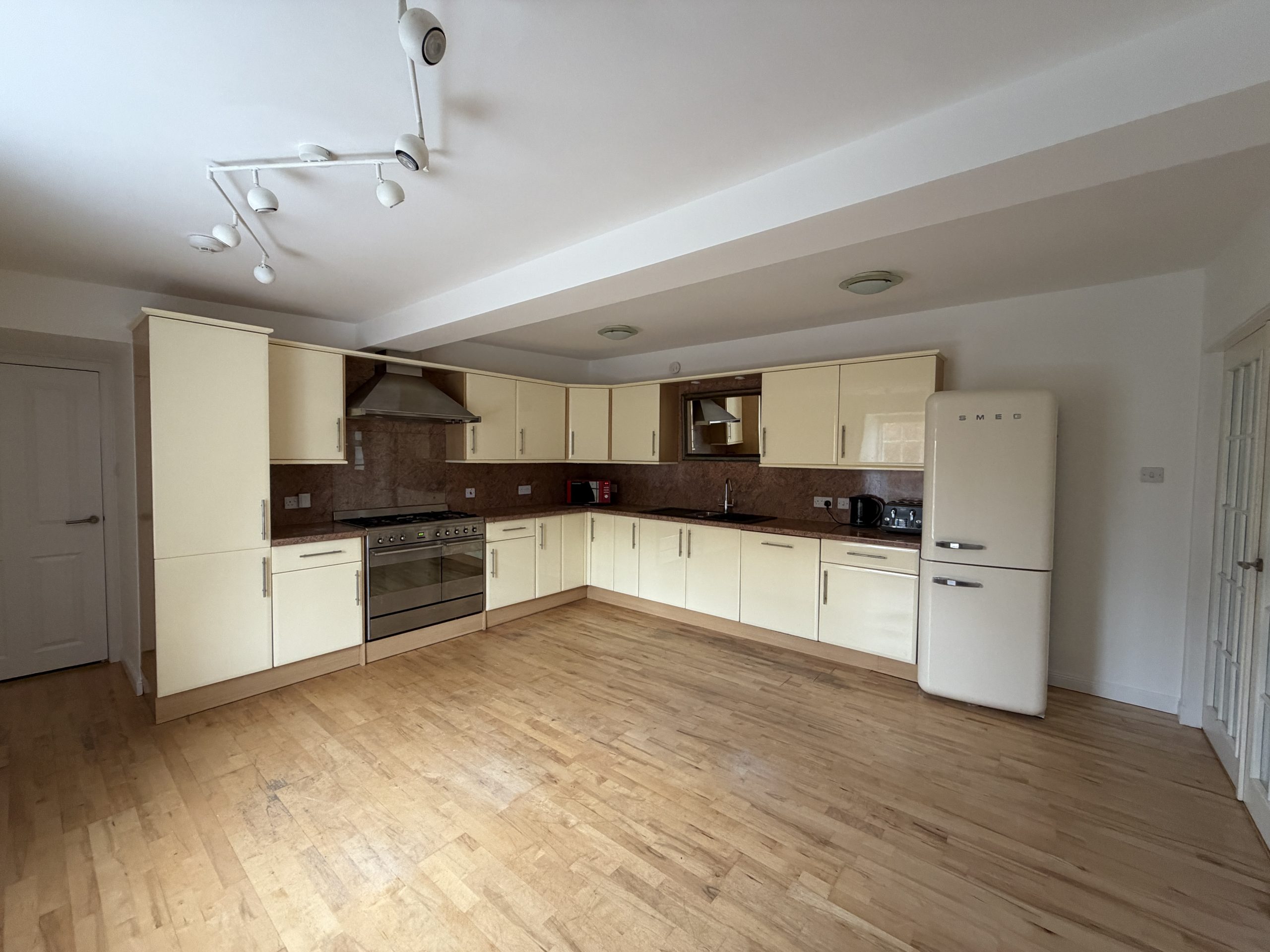 The dual aspect living room is a bright living space, enhanced by the movement of natural light through the glazed internal doors. The open fireplace offers a cosy focal point. The dining room provides a natural link between the kitchen and living room to the rear of the house and has space for a table seating four. Alternatively, this room could perhaps be used as an office or study. The modern kitchen contains a wide range of upper and lower cabinets, integrated range-style cooker with a 5-burner gas hob and double oven, and extractor above, as well as an integrated dishwasher. Space for a large fridge freezer and a breakfast table.