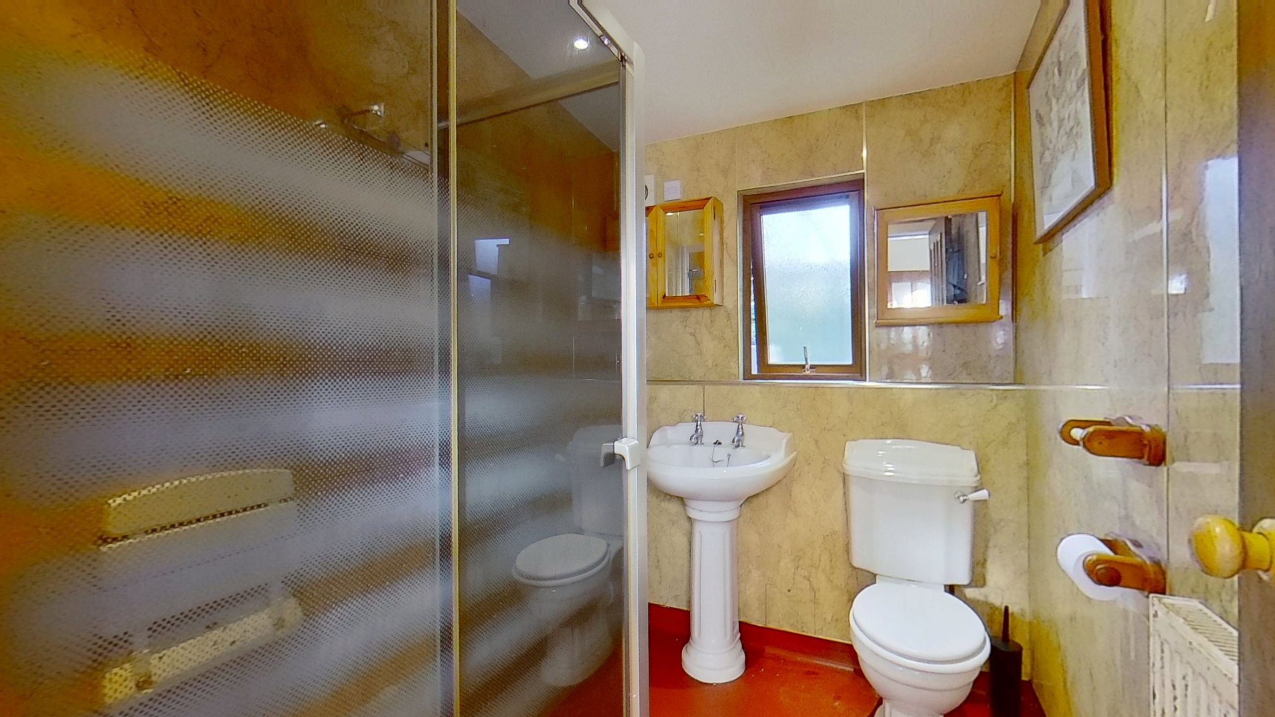 The shower room containing a 2-piece white suite comprising pedestal basin and WC has separate shower enclosure with a mains shower, the shower room is fully panelled with wet wall for ease of cleaning.