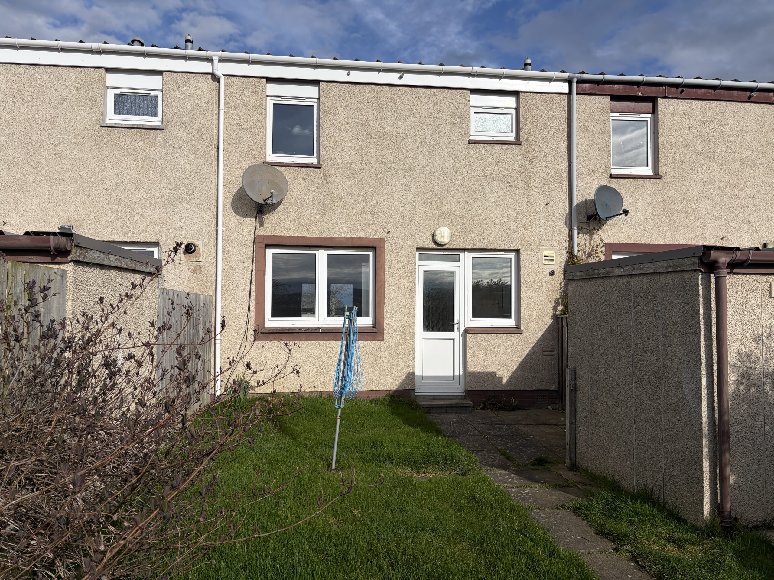 A bright and spacious 3-bed, mid-terraced, family home with fantastic views in the ever-popular southside area of Kinloss. Accommodation comprises living room, kitchen and WC on the ground floor and 3 bedrooms and a bathroom on the upper floor. Situated in a peaceful cul-de-sac, with back and front gardens and allocated parking, this property may appeal to small families, those looking to downsize as well as buy-to-let investors.Entering through the glazed front door into a vestibule, handy for coats and shoes, the hallway beyond is bathed in natural light and provides access to the downstairs accommodation and to the straight staircase. The spacious, dual aspect, living room has windows to the front and rear gardens and has plenty of space for dining. The bright kitchen has a range of upper and lower cabinets, a single stainless-steel sink, wall mounted gas boiler and space for a free-standing cooker and extractor fan above. Space and plumbing for a washing machine and space for further free-standing appliances.