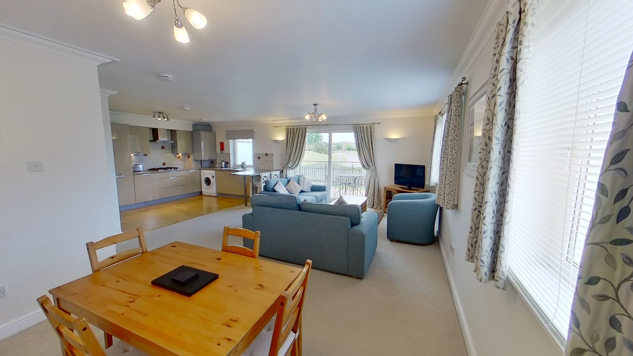On entering the apartment, a generous hallway with two storage cupboards leads to a desirable ‘L’ shaped open-plan lounge, kitchen and dining room, a fantastic space with sliding patio doors leading to the balcony, an ideal area on which to entertain and take in the views.