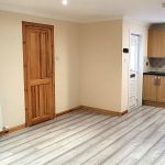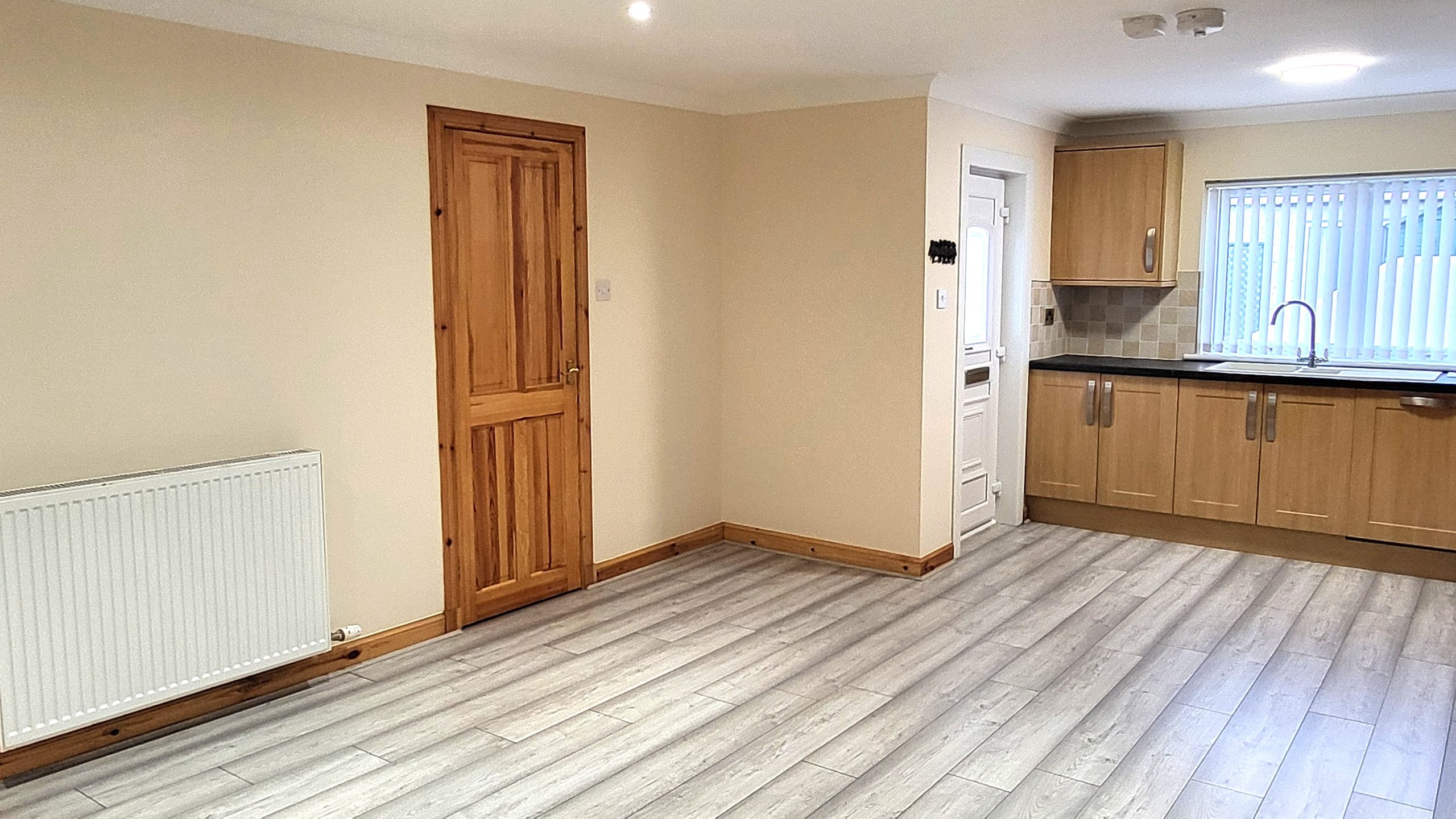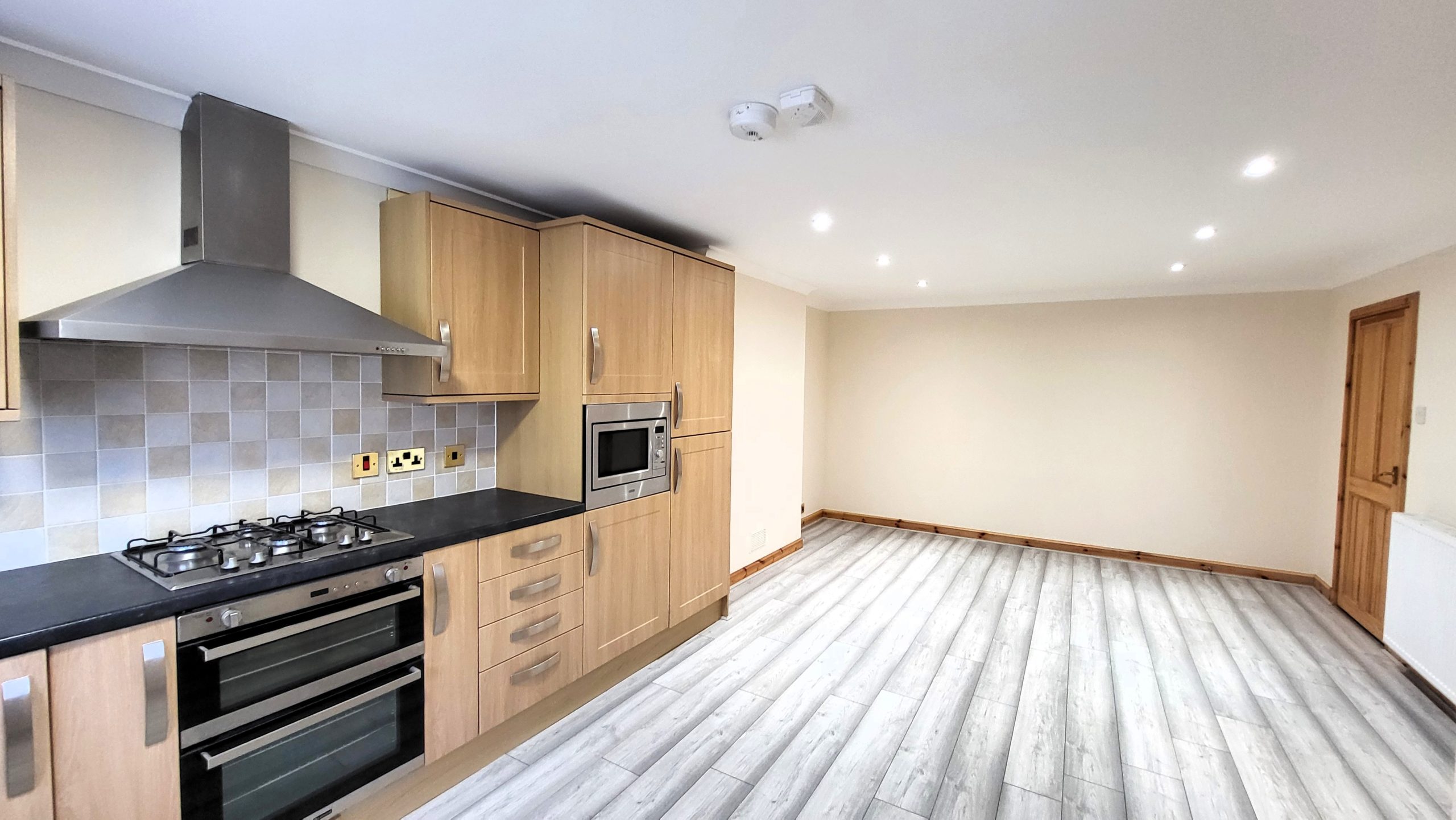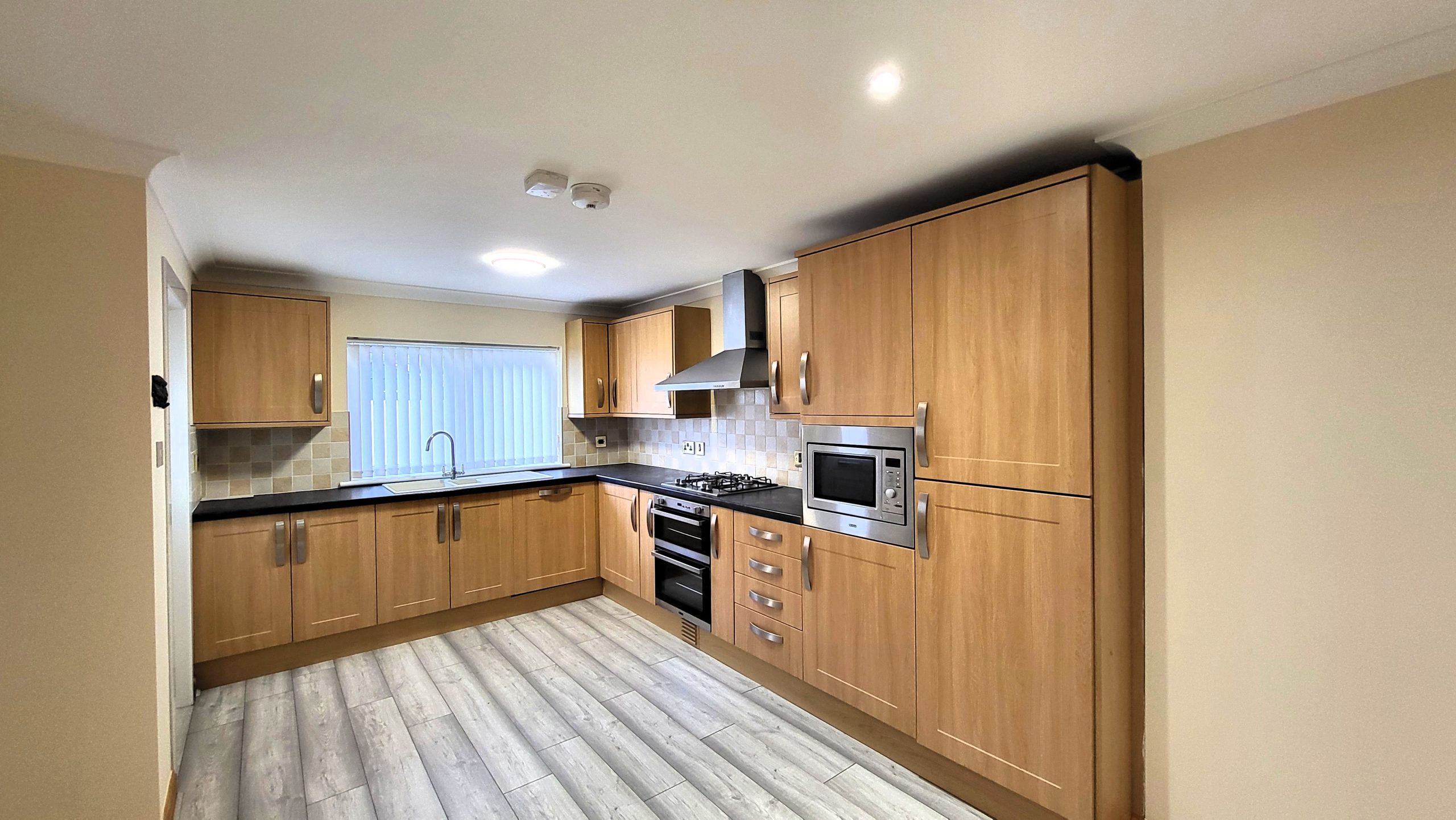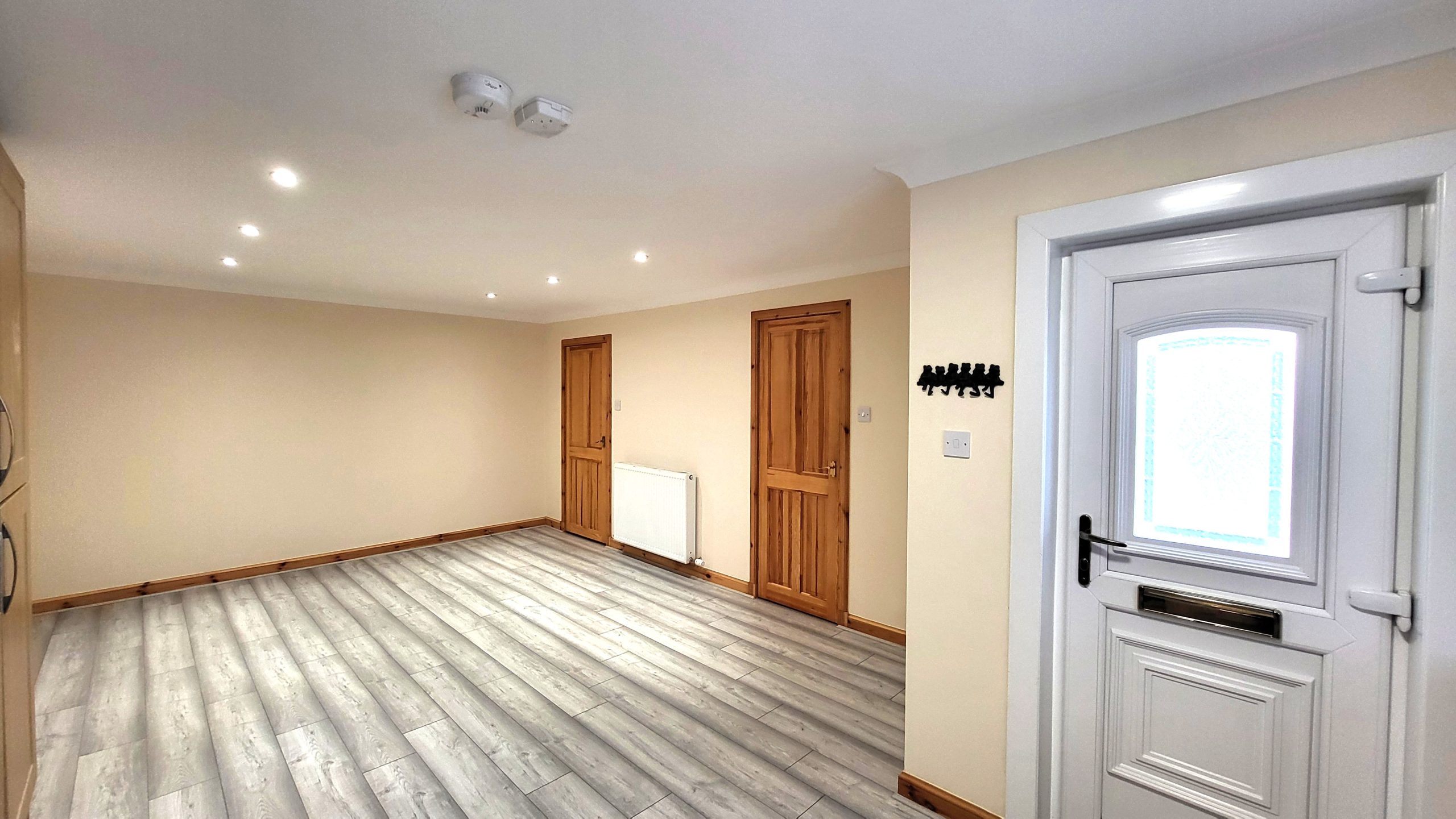 Entering through the main door, you are welcomed into a spacious dining kitchen featuring light wood-effect units, black laminate worktops, and a tiled splashback. A cream composite sink sits beneath the window, and the kitchen comes fully equipped with double electric ovens, gas hob, extractor hood, integrated microwave, fridge, freezer, and dishwasher. The slate-effect ceramic tiled floor adds practicality and style, while there is ample space for a dining table or seating arrangement. A large walk-in cupboard houses the Vaillant central heating boiler, with plumbing and space for a washing machine and tumble dryer, as well as shelving for additional storage.