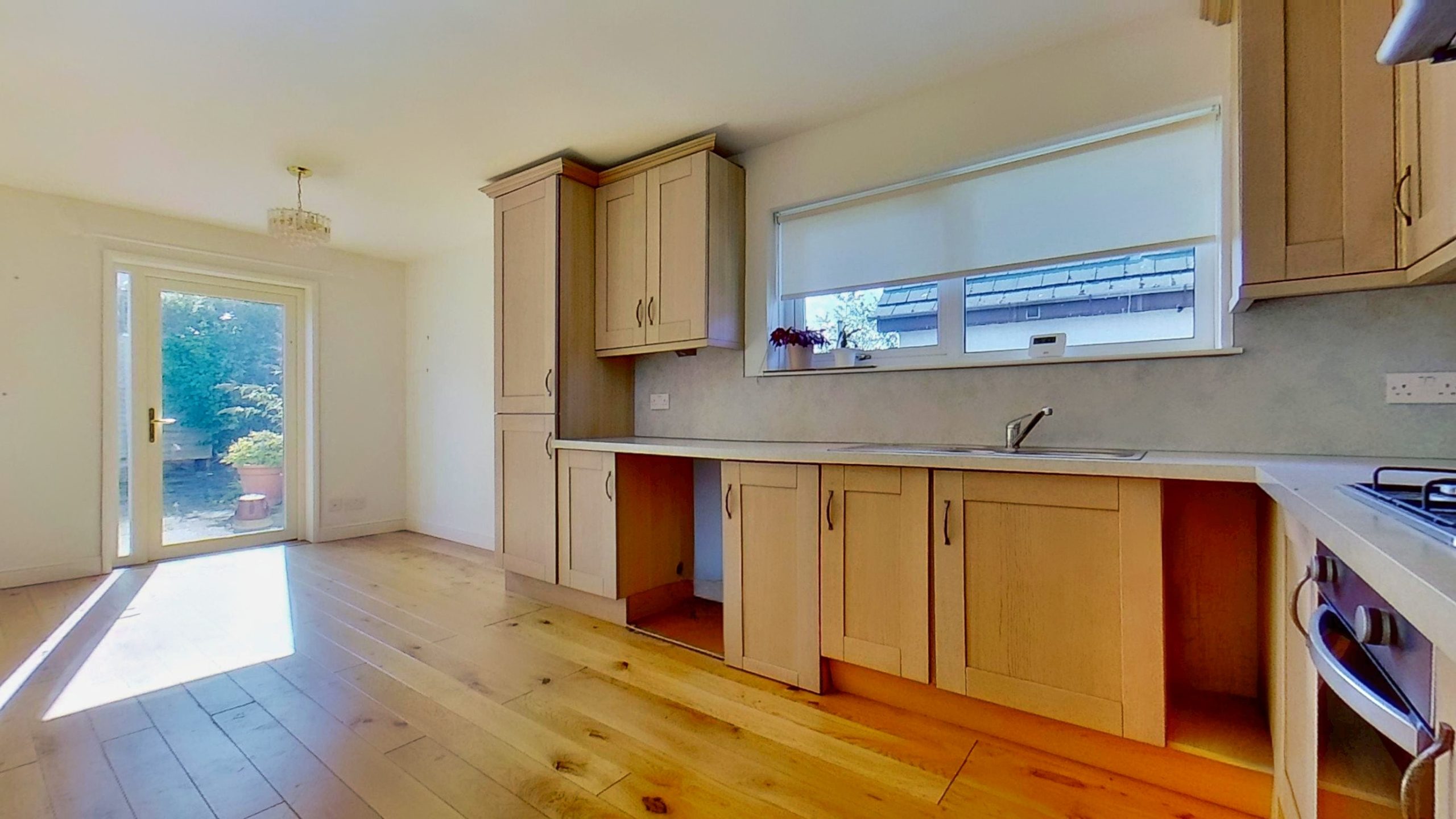 The spacious, dual aspect, kitchen diner has a patio door leading to the side garden and a window looking to the rear garden. Containing a good range of upper and lower cabinets, integrated fridge freezer, single oven and gas hob with extractor above. Space and plumbing for washing machine. A one-and-a-half stainless-steel sink sits beneath the window. The dining area has plenty of space for a table seating 4-6.