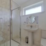 The shower room contains a 2-piece white suite comprising WC and pedestal basin. The separate shower enclosure houses a mains shower, is fully tiled and is fitted with a grabrail. Opaque front-facing window provides natural light and ventilation. Tiled flooring.