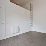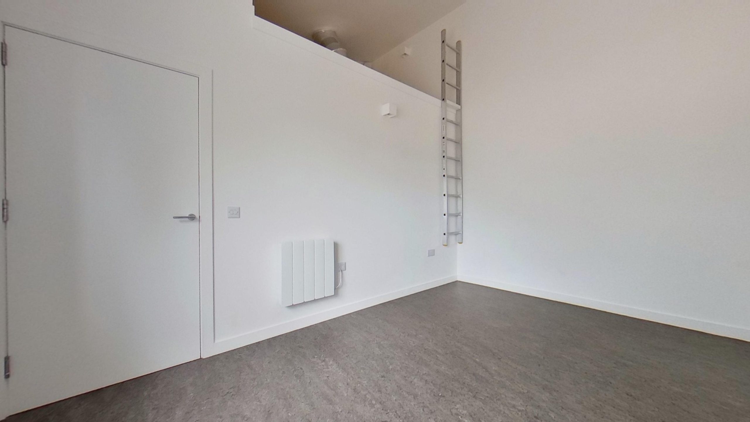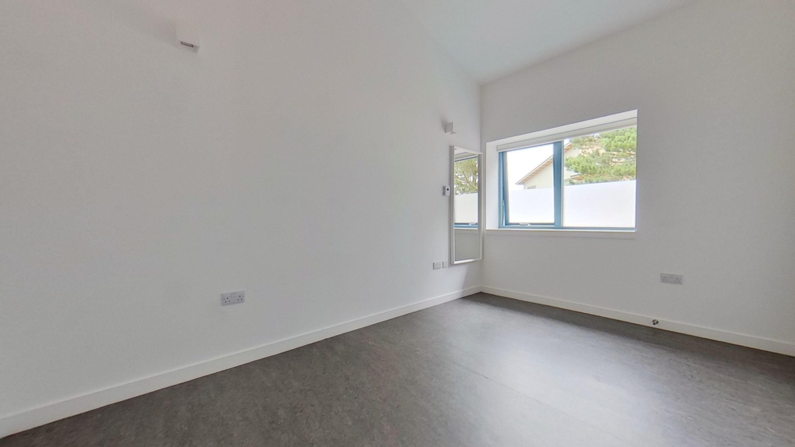The bedroom is designed for peace and relaxation, with a sloping ceiling ranging from 3.0m to 4.0m high. The room has lighting, sockets, and an electric panel heater. A window looks out toward the side of the home. There is access to a large loft space above the shower room.