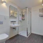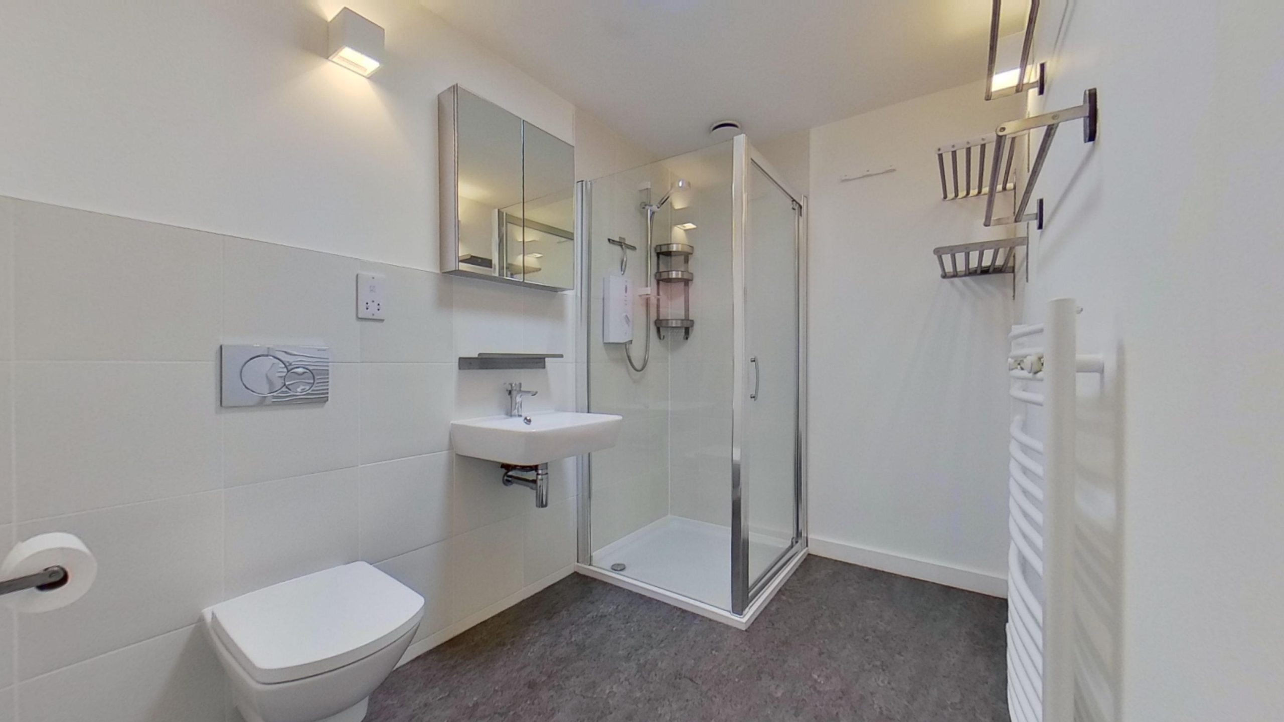 The spacious, upgraded shower room includes a white two-piece suite, separate shower enclosure with electric shower, and electric towel rail. A solar tube in the ceiling provides abundant natural light.