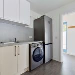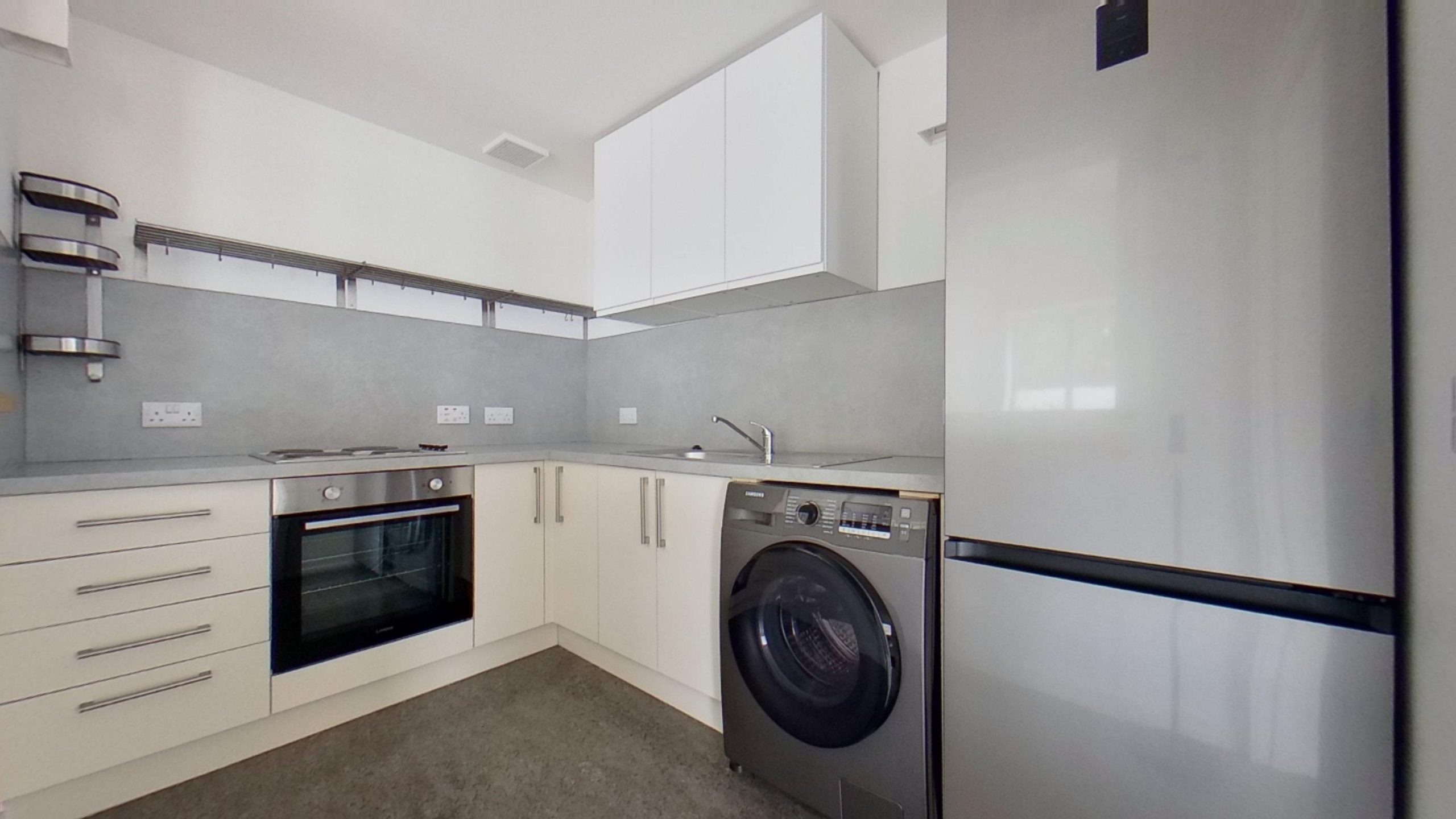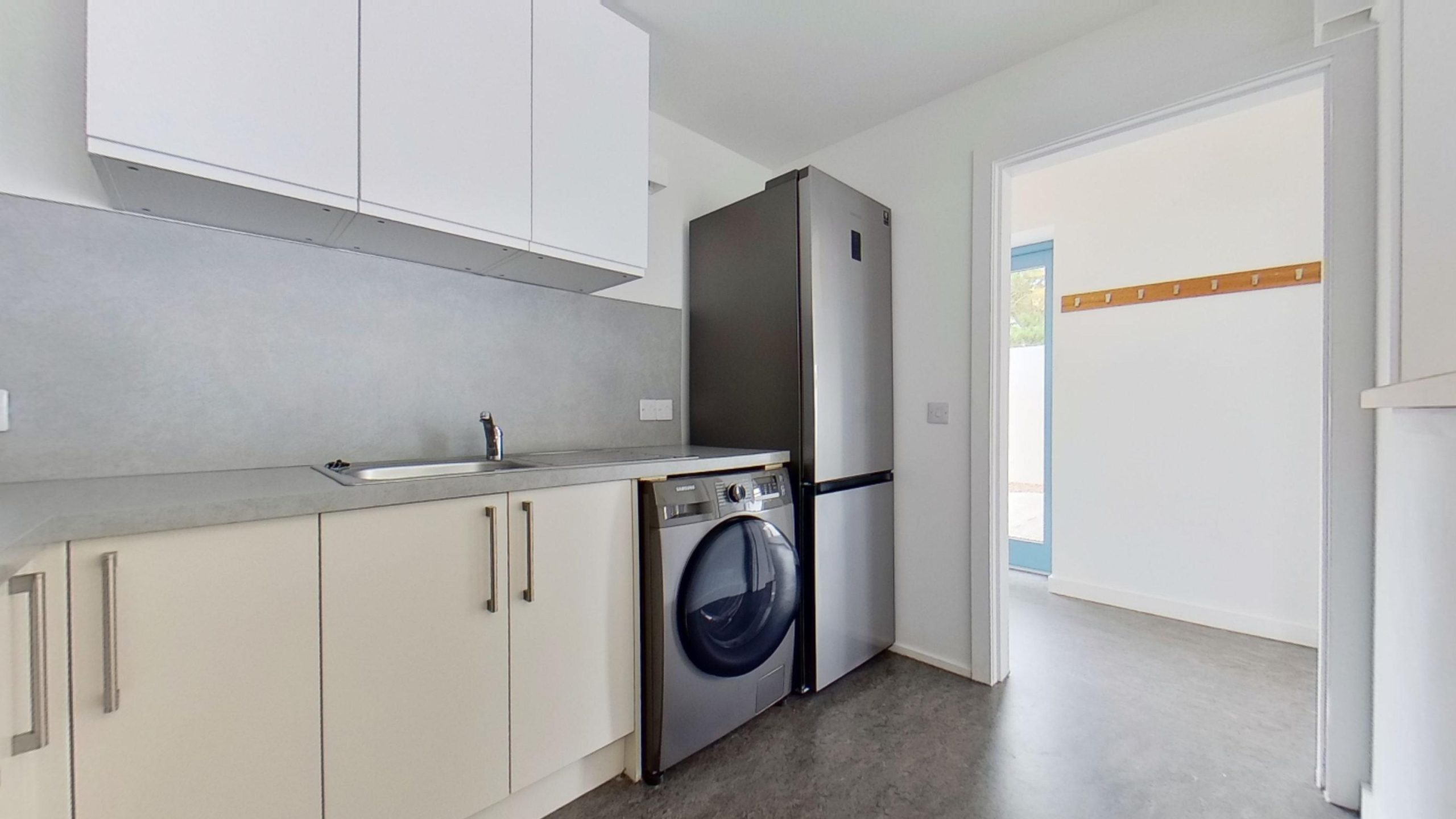 The recently upgraded kitchen features a clean, modern aesthetic with upper and lower cabinets, contrasting grey splash back, and integrated electric hob and oven. The design includes a fridge/freezer and washing machine, and lighting has been thoughtfully positioned to enhance the contemporary theme.