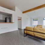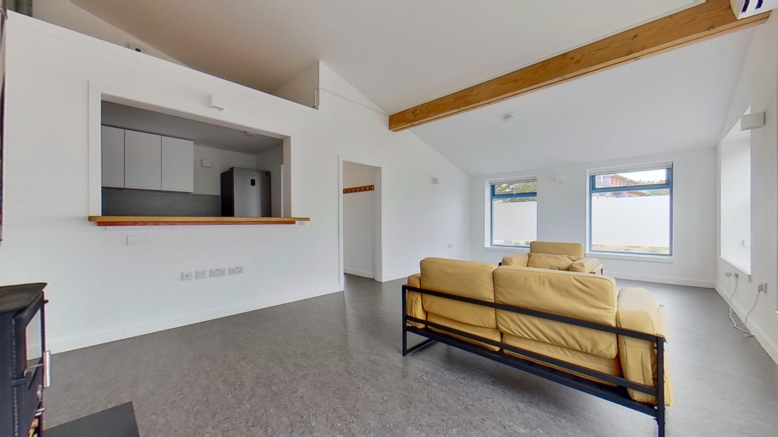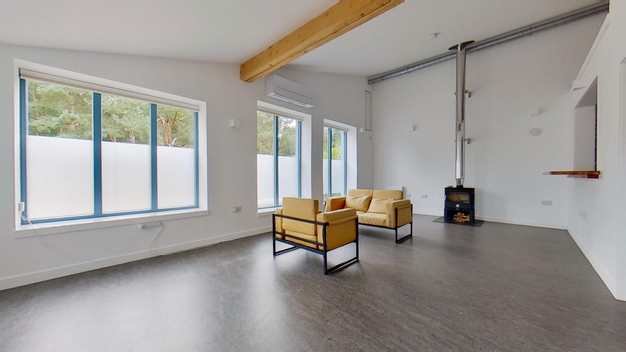 The spacious open-plan living room is the heart of the home. Natural light floods in through floor-to-ceiling windows on two sides, creating a serene connection to the outdoors. A striking wooden beam runs the length of the ceiling, while a modern wood-burning stove provides warmth and character. This versatile space could be reconfigured to include an additional bedroom. Above the kitchen is a generous mezzanine loft, ideal for additional storage.