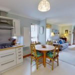 The sociable open-plan lounge/dining/kitchen is a generously sized dual-aspect room, filled with natural light and offering ample space for both relaxation and dining. A door opens onto a private South facing balcony, an ideal retreat for enjoying fresh air and sunshine.