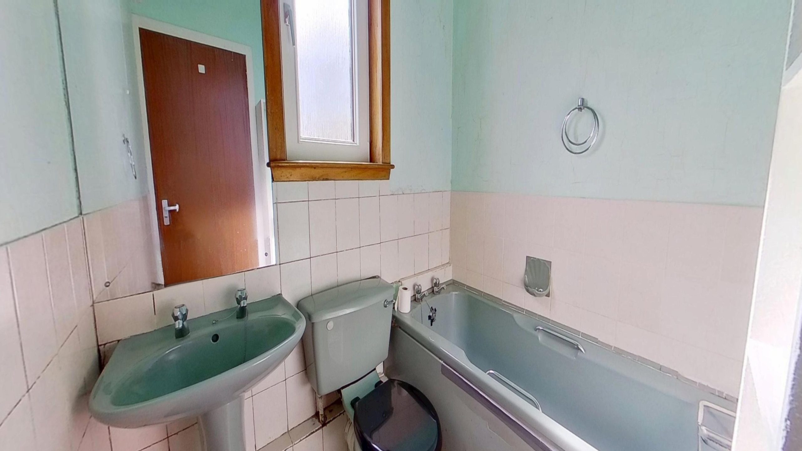 Also on the ground floor is the bathroom, fitted in a sage green WC, wash hand basin and bath, and completing this level, is a double bedroom with built-in wardrobe, and views to the rear.