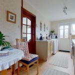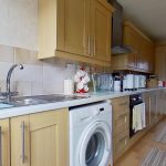 Spanning the width of the house, the bright sitting room is a welcoming space for relaxing and entertaining. Large picture windows overlooking the front and rear gardens allow light to stream in, with feature alcoves to either side of the chimney breast providing character. The kitchen, accessed from the living room, also spans the width of the house, with doors and windows to the north and south. With a wide range of upper and lower cabinets with integrated cooker, hob and extractor fan, and space for an undercounter washing machine, fridge and freezer, this ample kitchen has space to accommodate a breakfast table.