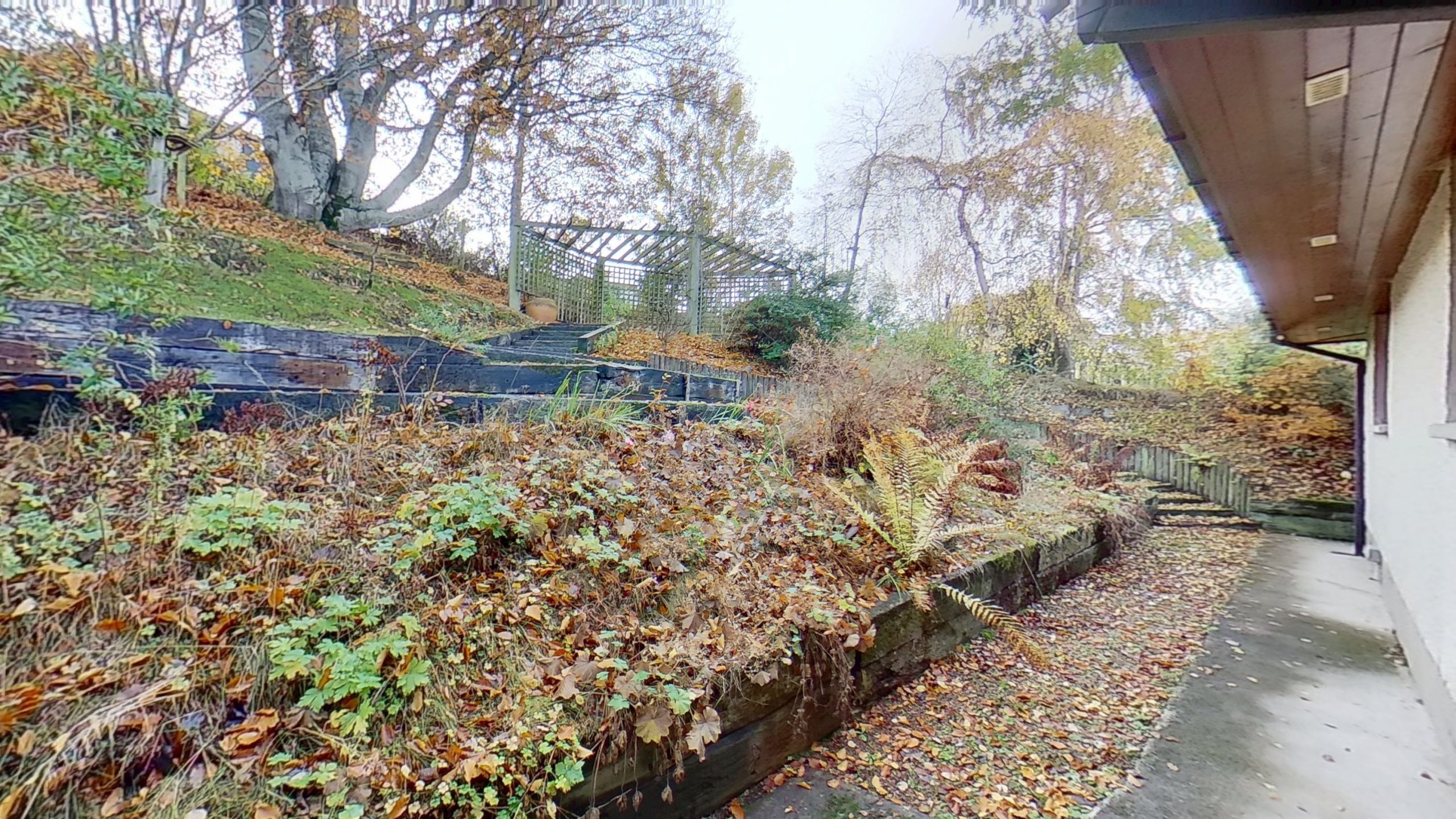 The front garden features a sloping lawn with a beautiful mature tree and some lovely shrubs. Paved steps with a turn lead to the front door, where there is an inset open porch providing shelter from the elements. To the side of the steps is a tarmac driveway bounded by pretty, stone, planting beds to one side and a long beech hedge to the other side. Steps from the top of the driveway lead to a paved path along the side of the house and into the well cared for, terraced, rear garden. A paved patio is a great spot for garden furniture on which to relax. The higher level of the garden is grassed and edged with a good variety of shrubs and small trees. The attractive timber pagoda is a great feature, perhaps a suitable space for meditation or reflection. Further, wooden, steps lead down to the path around other side of the house, where there is an open timber shed, currently used for bicycle storage, alongside which is a timber garden shed.