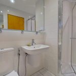 Lovely modern and bright convenience containing 2-piece white suite comprising wall-mounted basin with shower attachment and a WC. Separate shower enclosure with mains shower. Fully tiled walls and flooring. Large wall-mounted mirror with glass shelf beneath and a wall-mounted medicine cabinet with mirror door. Window providing light and ventilation.