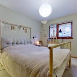 A large double bedroom with window looking over the front garden, across the rooftops of town and hills in the distance. Alcove shelving and double built-in wardrobe.