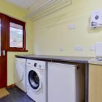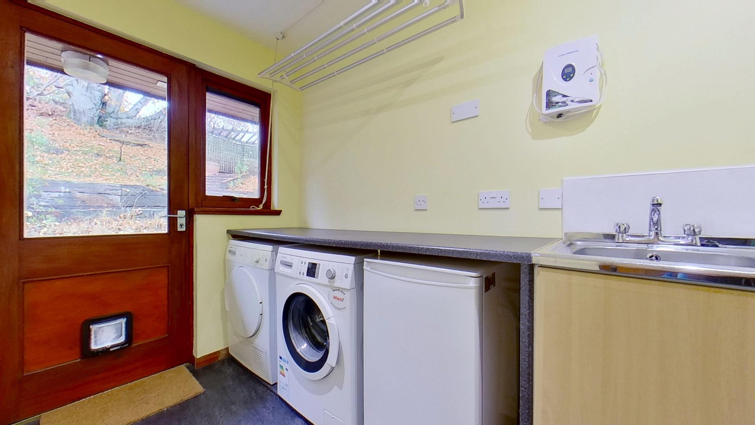 The utility room contains a stainless-steel sink with drainer, with storage below. Space and plumbing for washing machine and dryer and additional space for an undercounter appliance, such as a freezer. Ceiling-mounted pulley offers an eco-friendly approach to laundry days. External, glazed, door leading out to the rear garden. Side window.