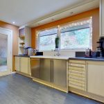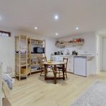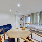 Previously used for a home-based business, now arranged as a bed-sit, this spacious accommodation has a wooden door with glazed panels leading to the driveway and 2 floor-to-ceiling windows, making it a lovely, bright, space. Further high-level window. Plenty of room for a bed, sofa and other furniture, and a good amount of storage in the form of 2 double built-in wardrobes with sliding doors. The open-plan kitchen area has drawers, countertop, ceramic sink with mixer taps and cabinet beneath, plumbing and space for a washing machine and space for undercounter fridge. Large storage shelf and hanging hooks above the sink, great for pots, pans and utensils.