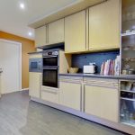 This lovely kitchen contains a good range of upper and lower cabinets, some of which have decorative opaque glass doors. Integrated double oven, microwave, 5-burner gas hob with extractor above, dishwasher and under-counter fridge. A light-coloured composite sink with drainer and mixer taps sits beneath the wide window looking over the pleasant rear garden. Door to utility room.