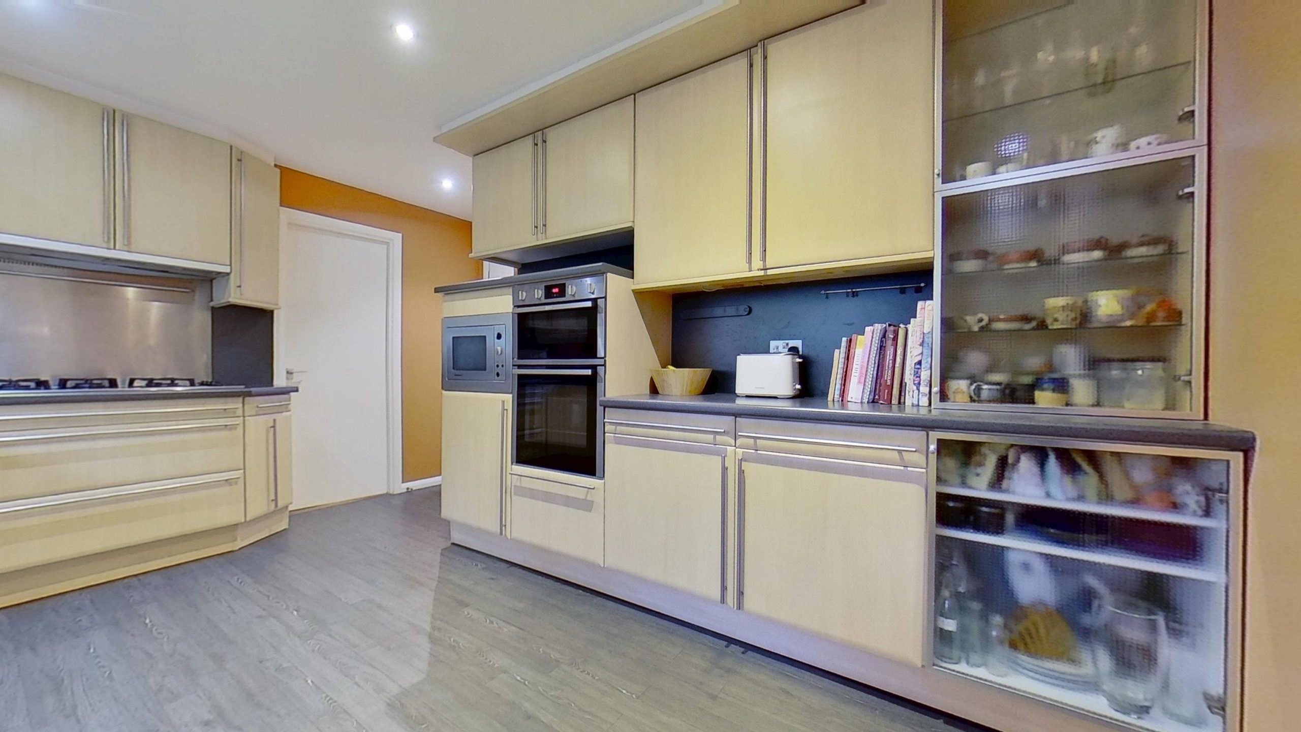 The generous lounge is a welcoming, dual aspect, family room with a large picture window looking over the front garden and taking in views of the rooftops of town beyond. Further side-facing window. The flow of natural light through the lounge and hallway is enhanced by a glazed door with glazed side screens. The dining room has plenty of space for a table seating 6-8, with lovely wooden shelves offering a degree of distinction from the lounge. Sliding patio doors provide lots of natural light and lead out to the rear garden, allowing ease of transition between internal and external entertaining. Glazed door connects dining room and kitchen.
