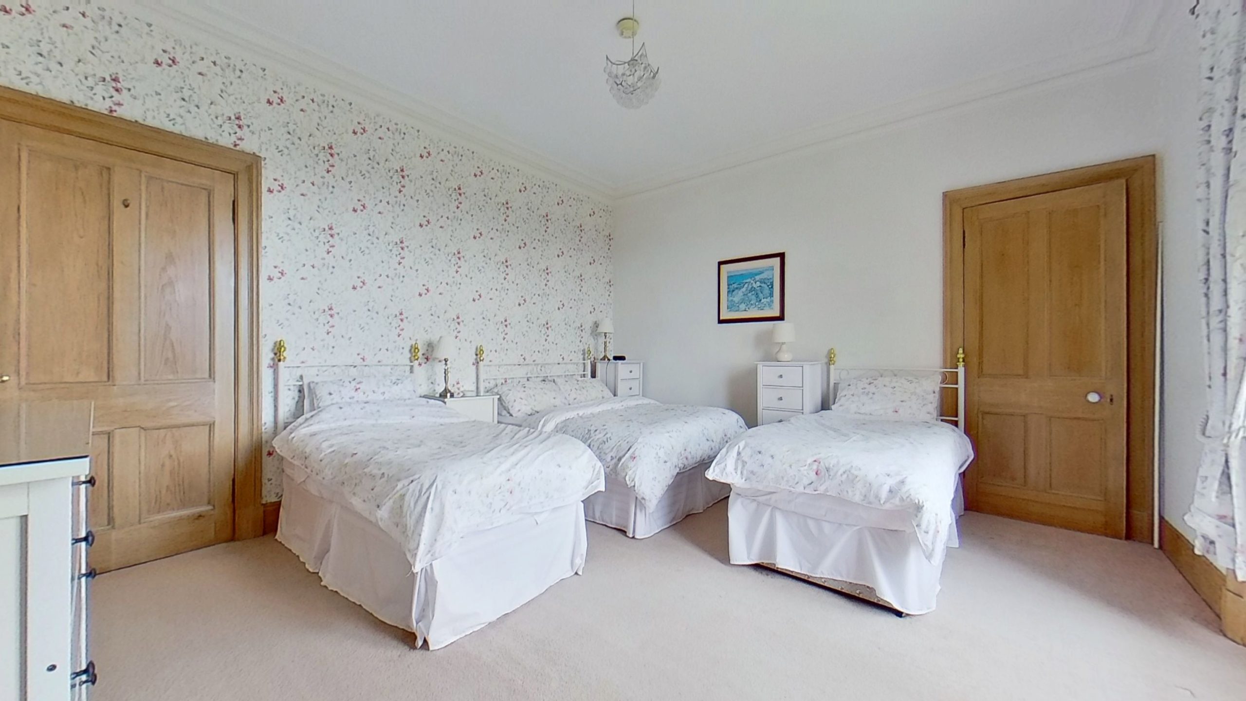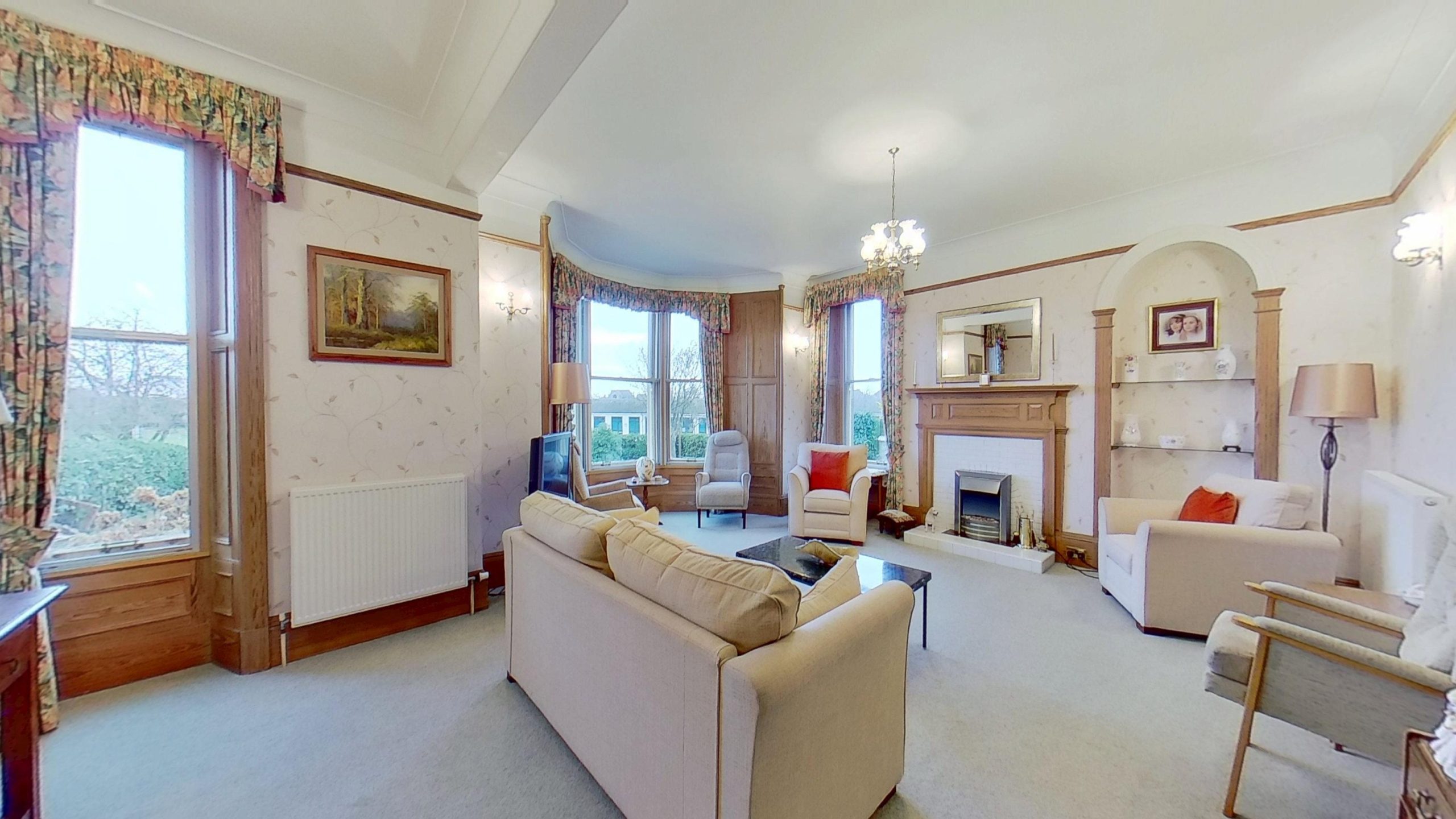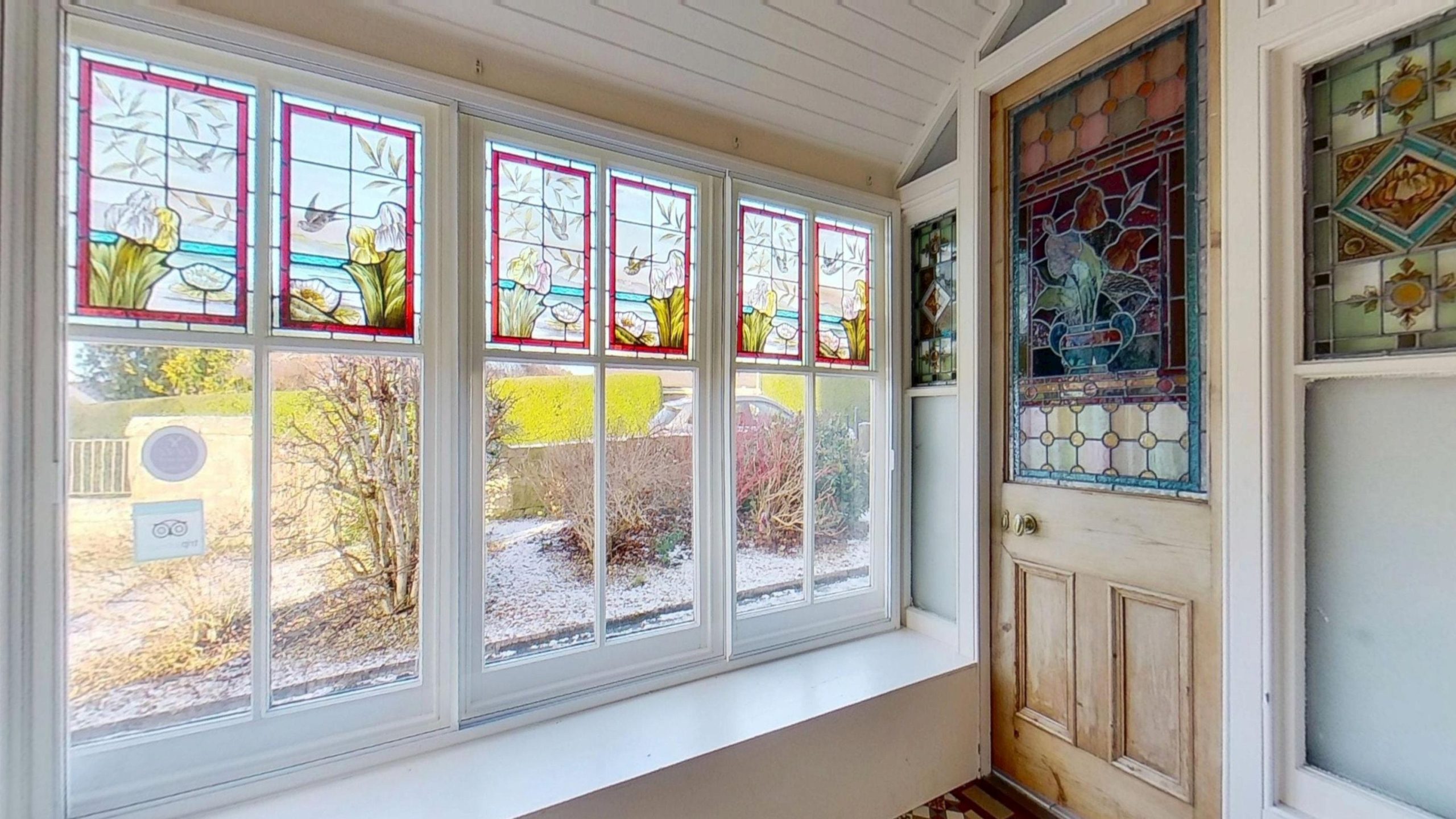 A large vestibule, with original tiled flooring and elegant stained-glass windows welcomes you into the house. A spacious shower room is located to one side, with a substantial, original, pitch-pine door in sandstone arch, opening into the wide character hallway.