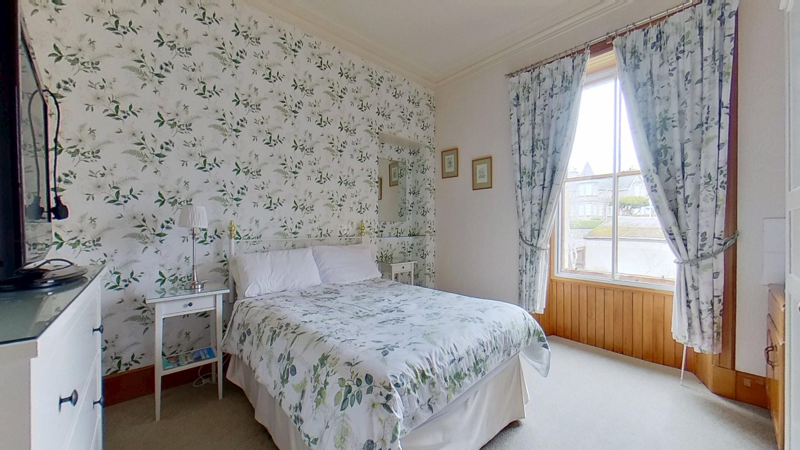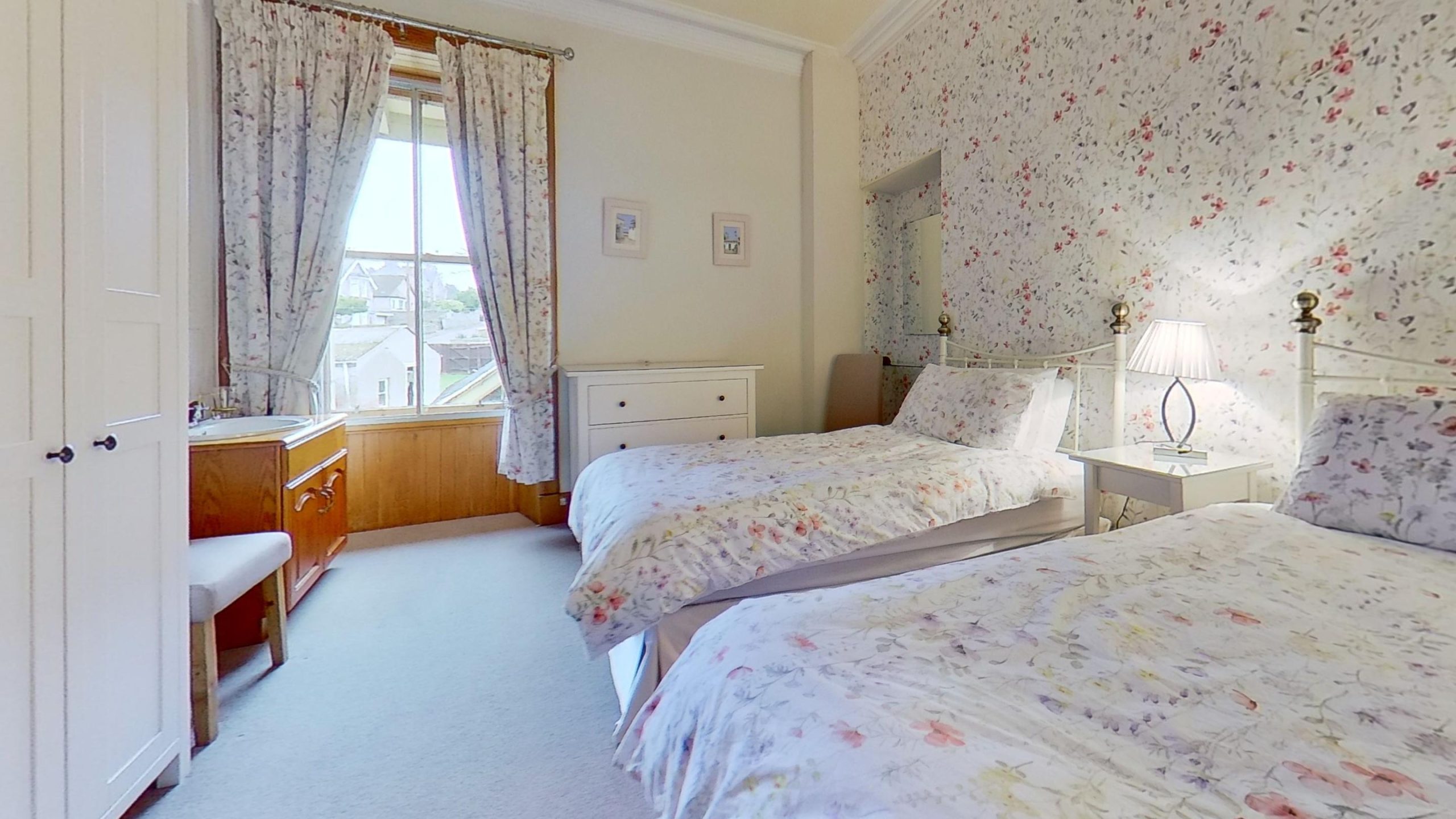 Half-glazed double doors lead out to the rear garden, and a carpeted staircase leads to an upper floor double bedroom, Bedroom 6, which was formerly the maid’s room. A perfect retreat for a home office or private bedroom for a teenager or family.