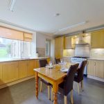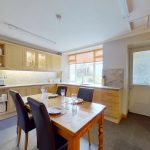 The dining kitchen, to the rear of the house, is fitted with a wide range of upper and lower cabinets with a composite one-and-a-half sink, integrated dishwasher, wall-mounted grill and a large free-standing Rangemaster gas stove, with overhead extractor fan. Ample space for a further large table to sit 8. Leading from the rear of the kitchen is a large utility room/maid’s area, with a sink and the boiler. From the utility room is an additional storage area and the downstairs WC .