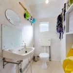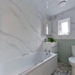 This ultra-sleek bathroom contains a white 3-piece suite comprising a WC, wash basin inset to a handy storage unit containing drawers, and a bath with overhead mains shower. A neat balance of wet wall material and painted wood panelling showcase both traditional character and modernity. The rear-facing, opaque, window offers natural light and ventilation. Attractive, contemporary tiled flooring.