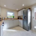 A doorway from the living room leads into the recently newly renovated and fully insulated kitchen, through a small connecting corridor. This bright and strikingly modern kitchen contains a good range of grey upper and lower cabinets and a one-and-a-half stainless-steel sink sits beneath the window looking to the side garden. Integrated single oven and induction hob, with glass backsplash and extractor above. Space for a free-standing fridge freezer. Vinyl flooring. Half glazed timber external door leading out to the rear garden.