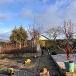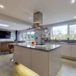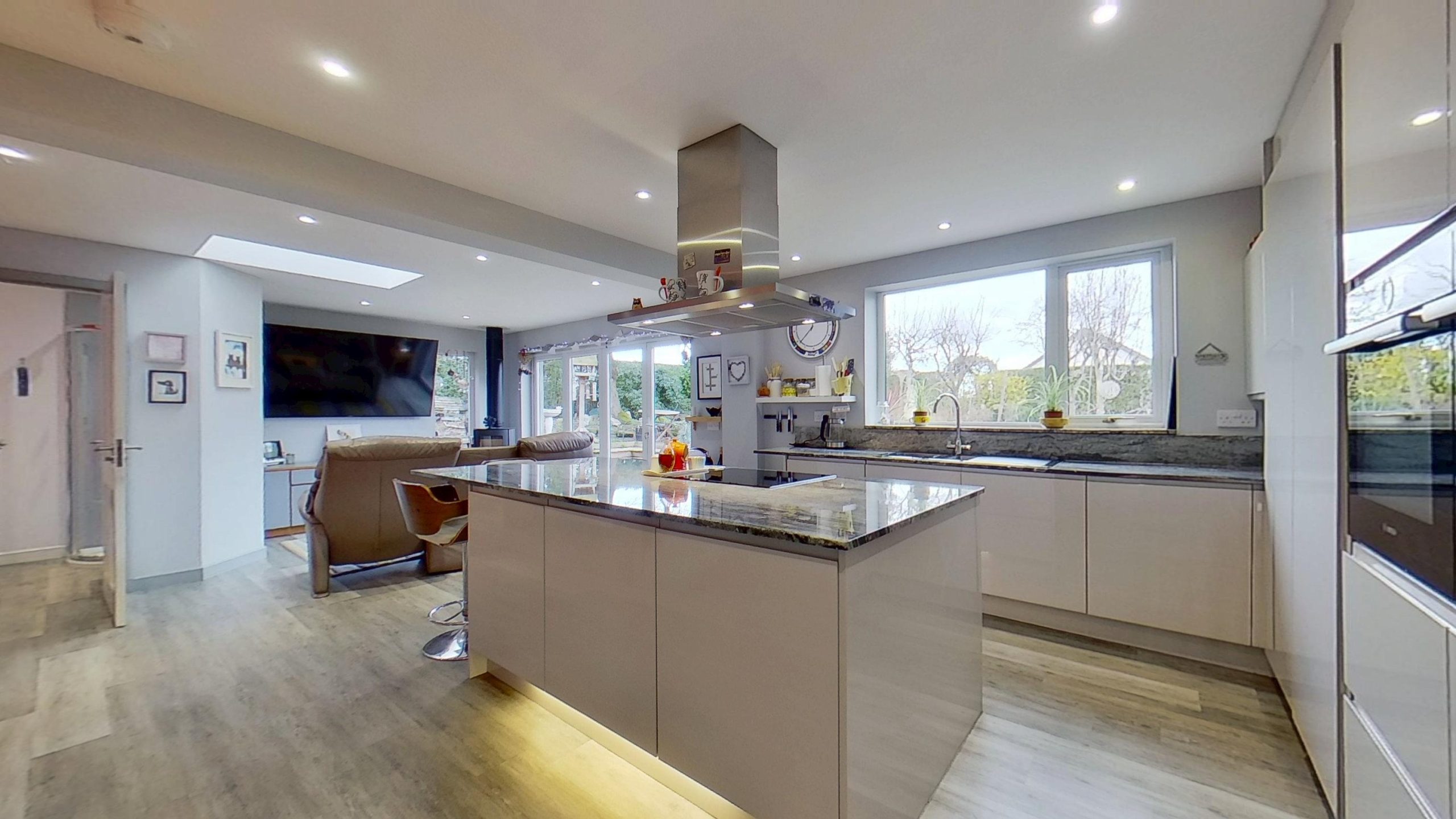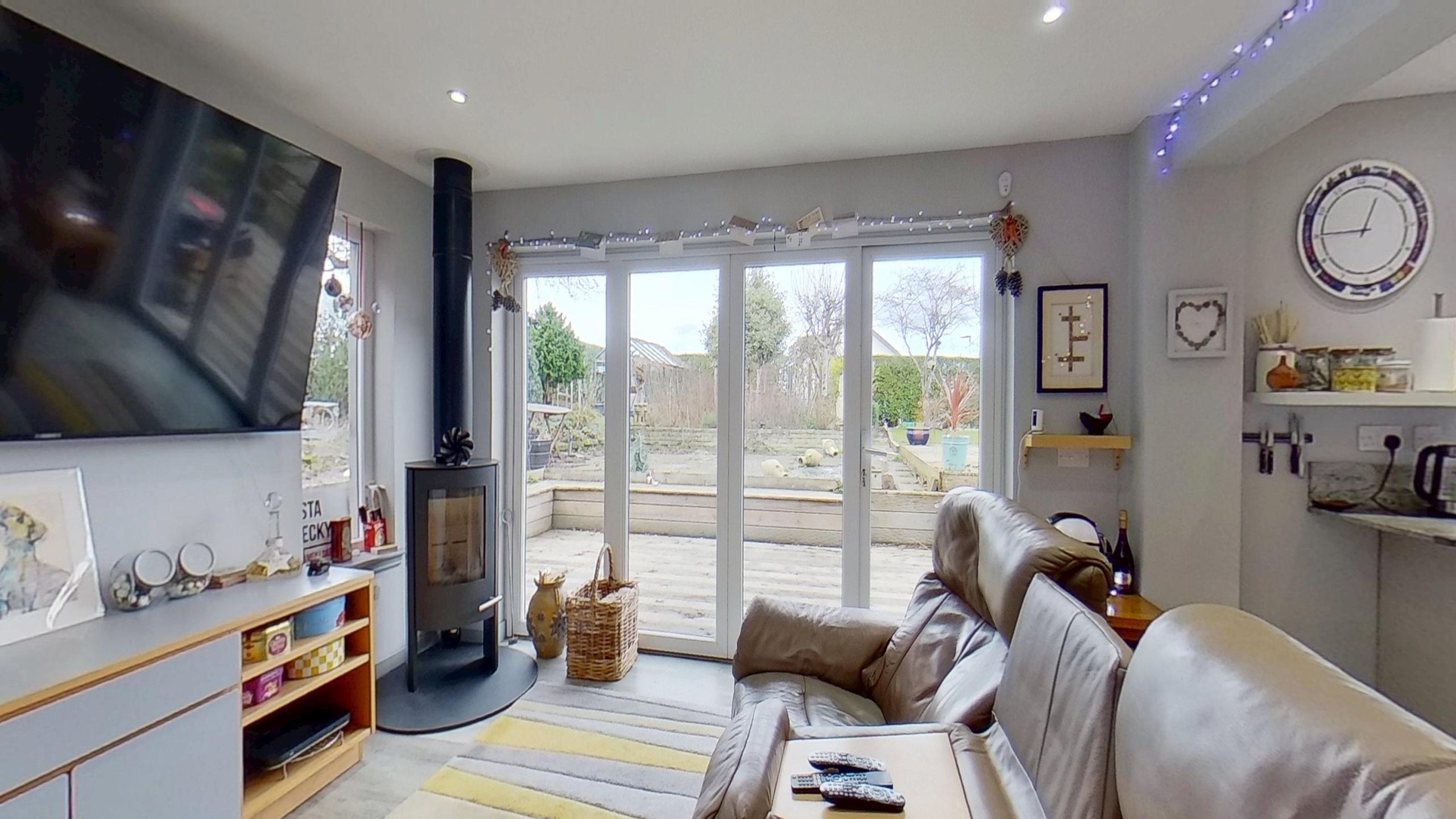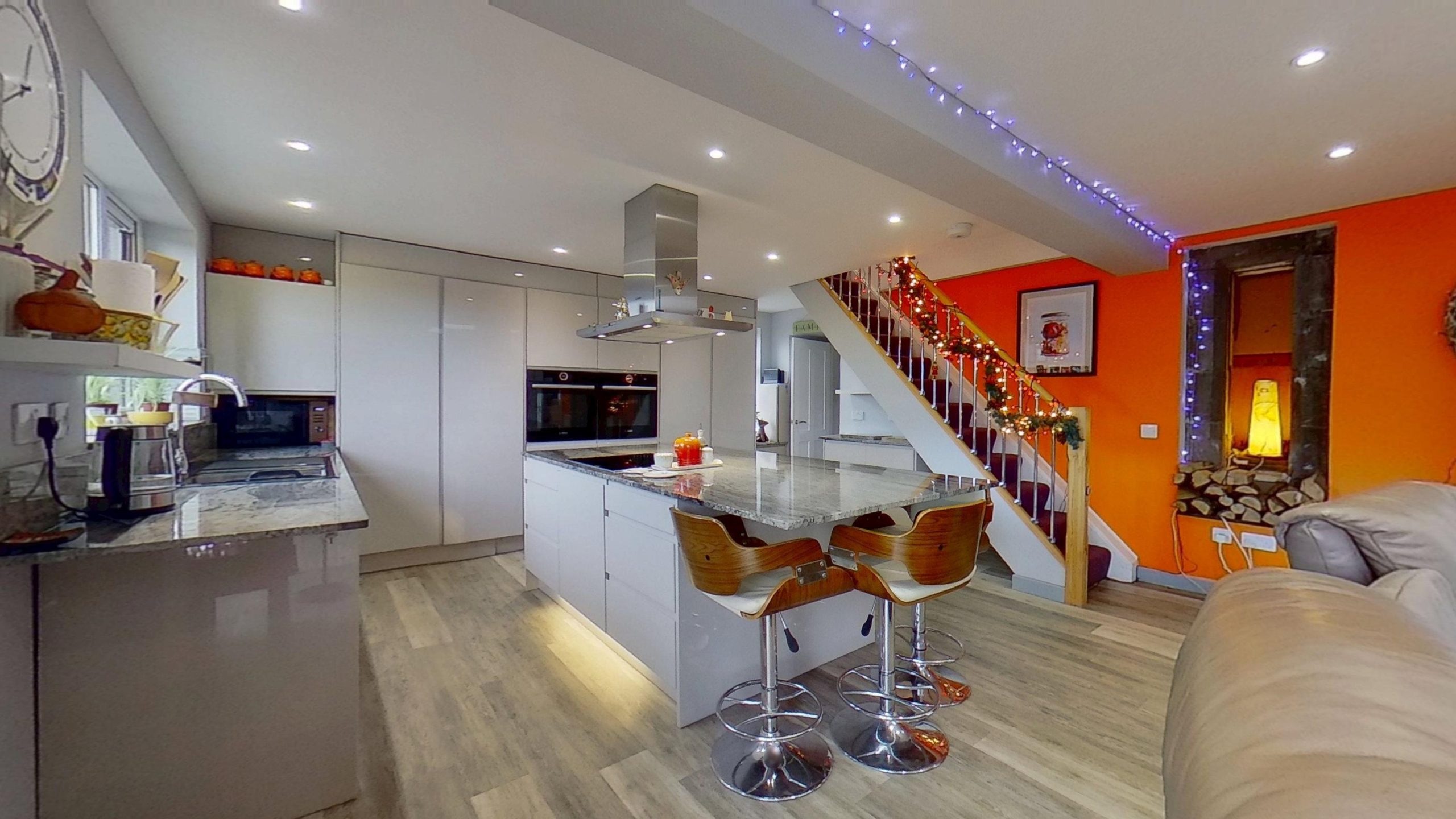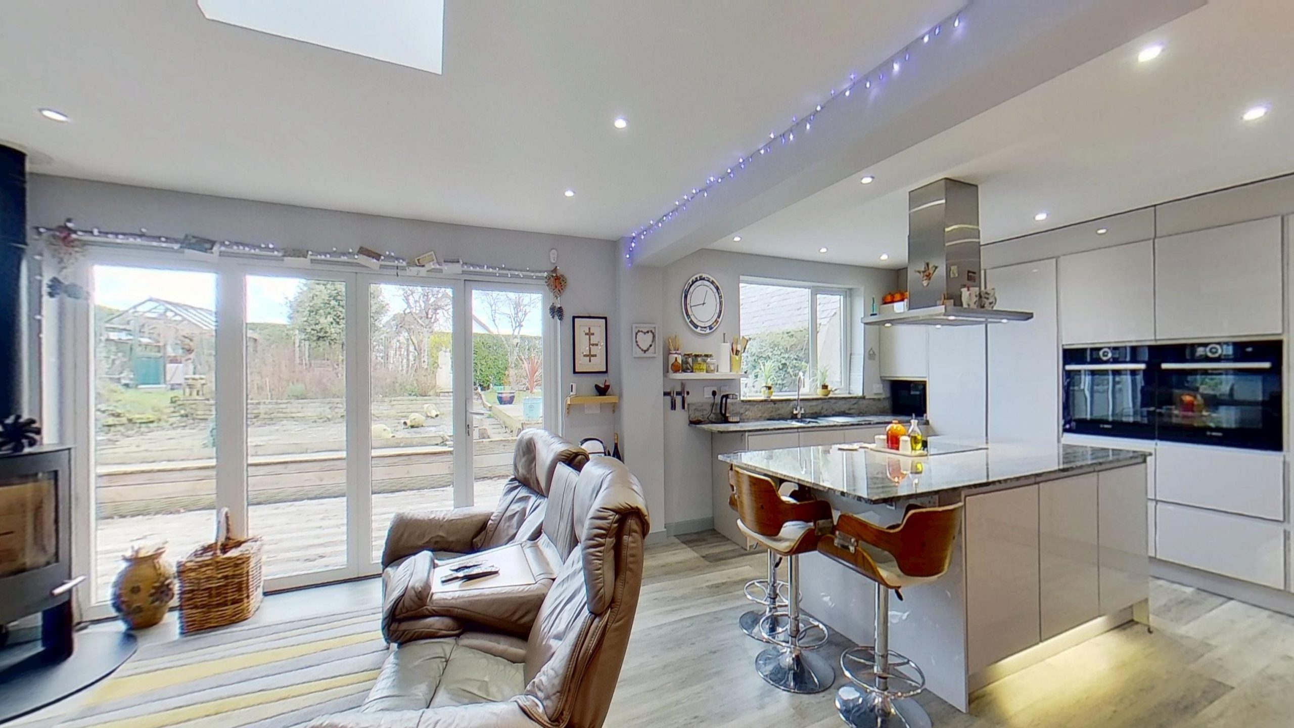 A super-bright, triple-aspect, dining kitchen/living room bathed in light streaming in through the large picture window looking to rear garden. A patio door leads out to the garden and further tall windows enhance the indoor/outdoor connection. The kitchen is fitted with pristine piano key finish cabinets and drawers and tall, pull-out, larder-style cupboards, an integrated fridge, freezer, dishwasher and 2 ovens. A lovely island with a marble top boasts an inset induction hob with stainless-steel extractor hood above. A wonderful feature of this open-plan living space is the large, curved, wood burner sitting on a slate hearth, bringing warmth on those cooler evenings.