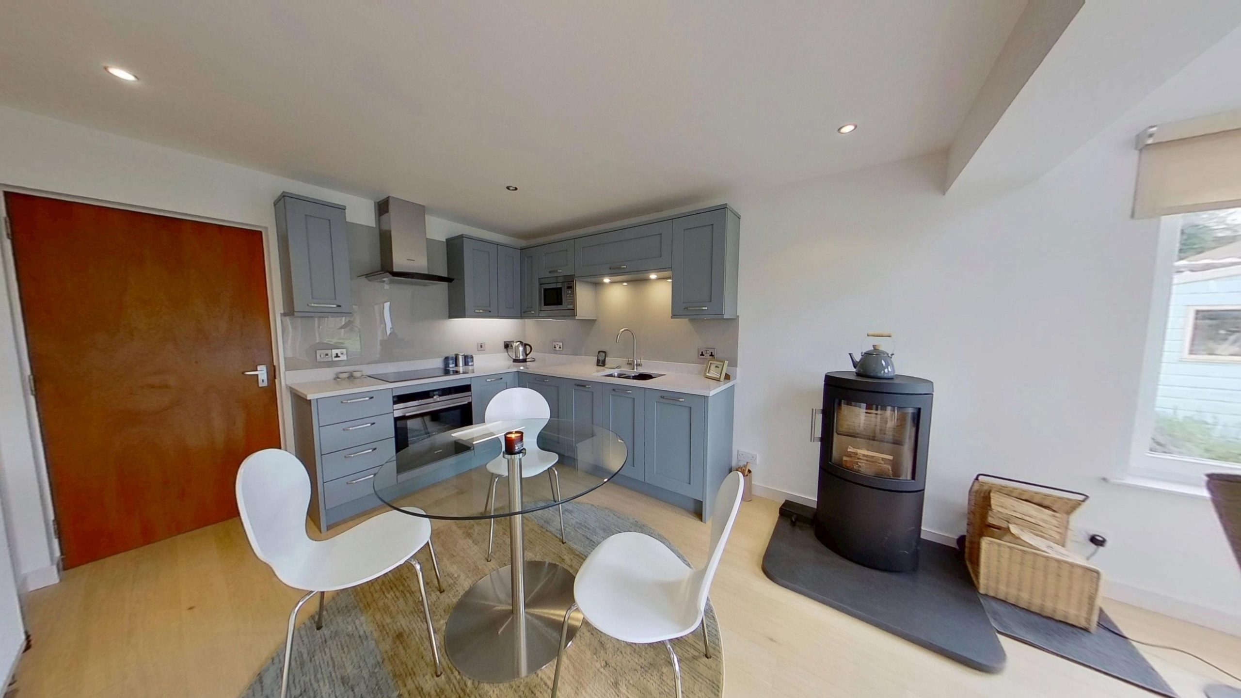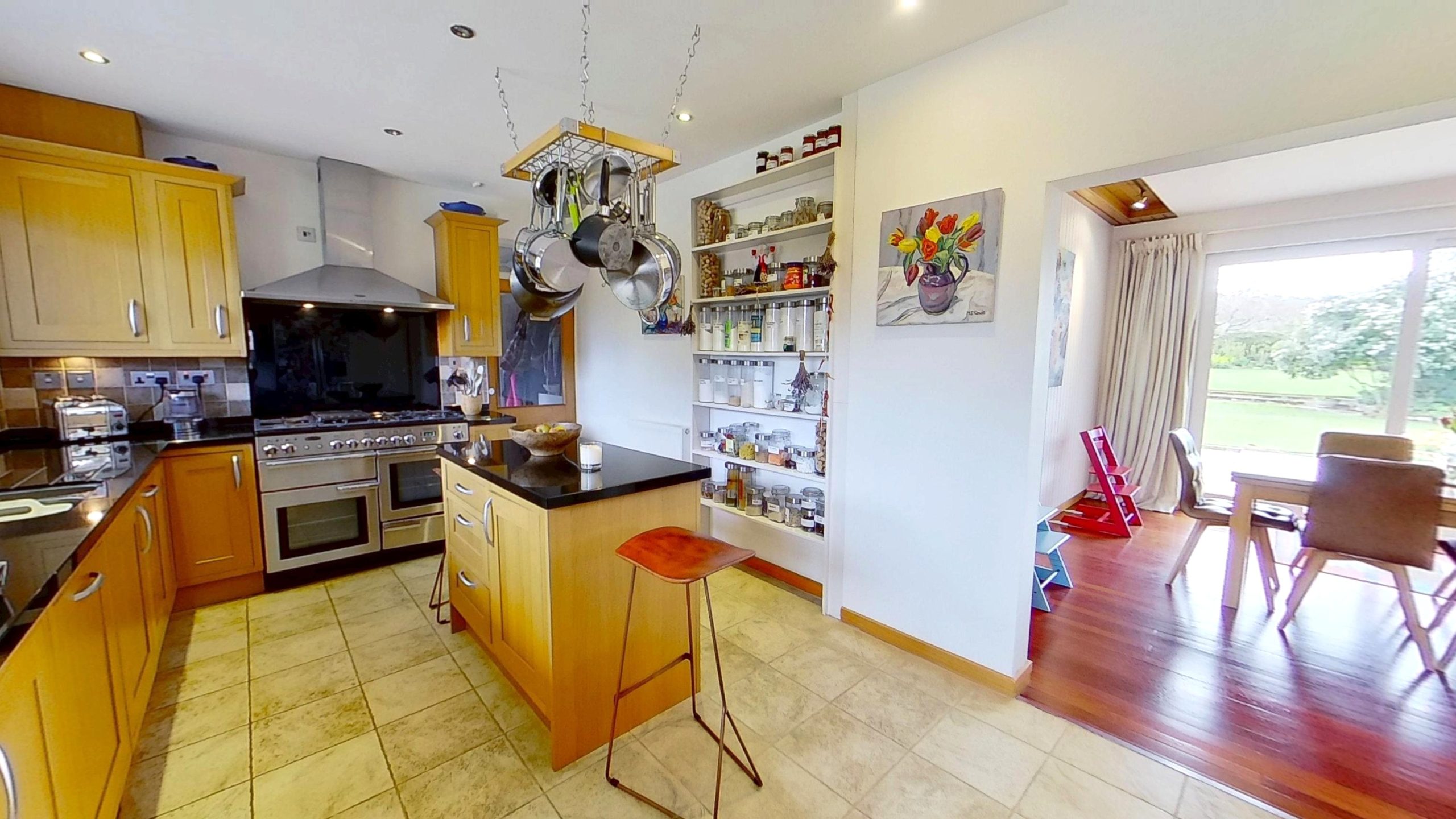 The main house is bright, light-filled and a pleasure to spend time in. The inviting lounge features a wood-burning stove and a striking full wall of glass to maximise enjoyment of the garden views. Bi-fold doors open to a dining room with ample room for entertaining and patio doors leading out to the patio area. An archway connects through to the well-appointed kitchen, fitted with oak wall and base units complemented by stunning black granite worktops. The kitchen includes a one-and-a-half bowl sink positioned below the front-facing window, dishwasher, an impressive six-burner Rangemaster cooker with two ovens, grill and extractor above, as well as an oak and granite island and a wall of open shelving ideal for storage and display.