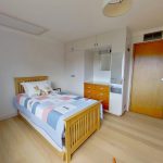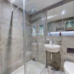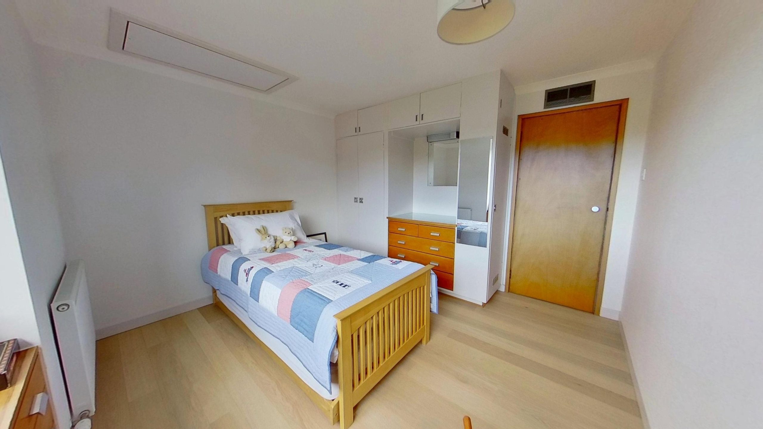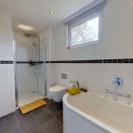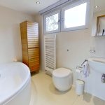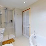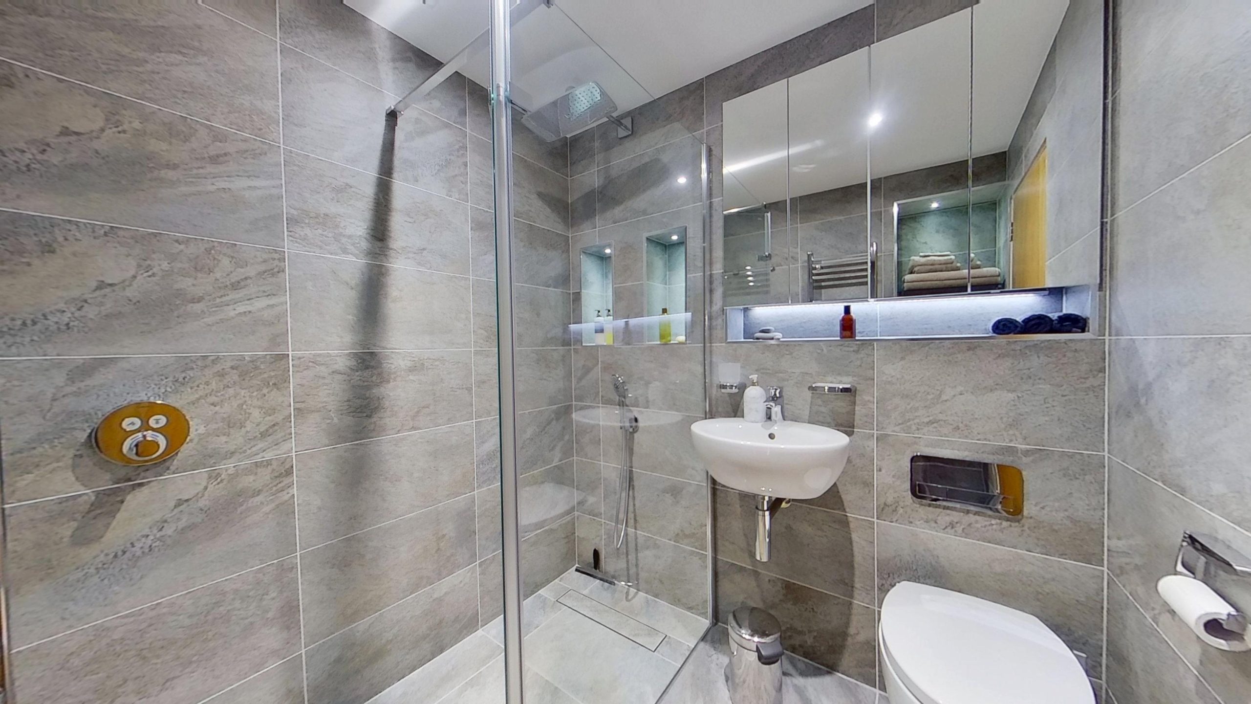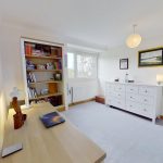 The double bedroom overlooks the garden and is served by a beautifully refurbished wet room finished with stylish stone-effect wall and floor tiles, WC, wash hand basin and a sleek shower enclosure fitted with Hansgrohe rain and handheld showers.