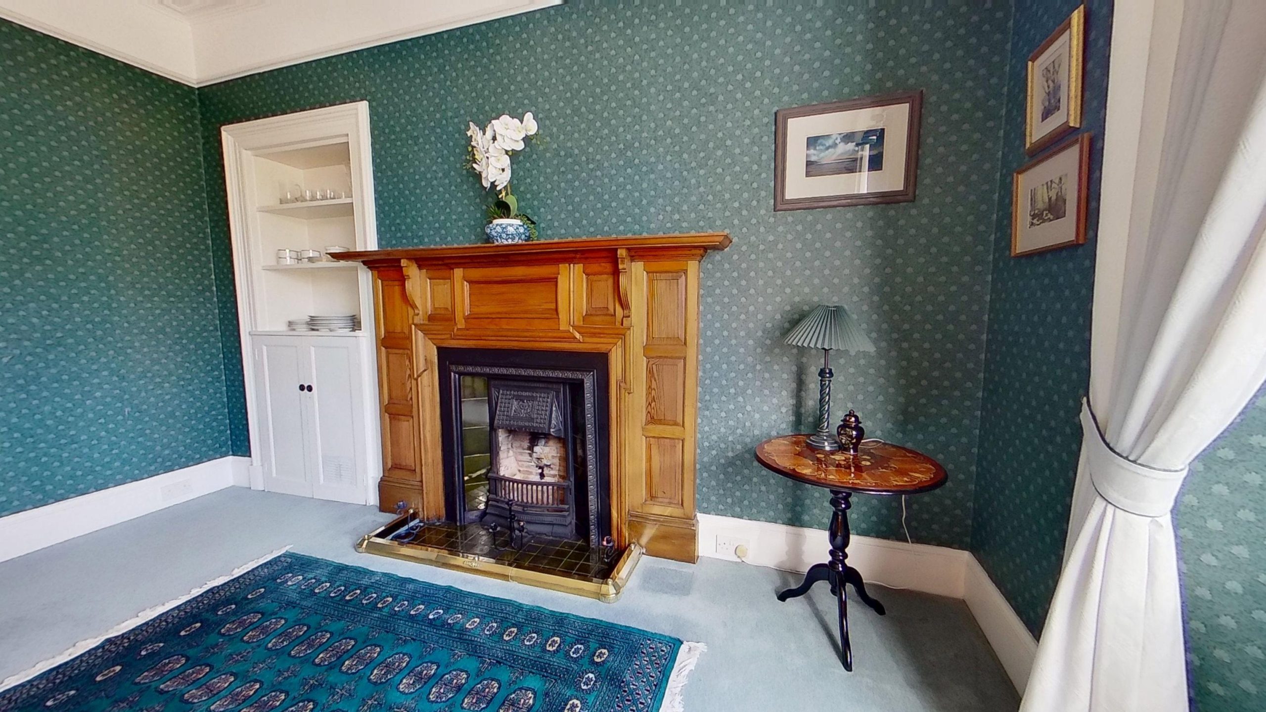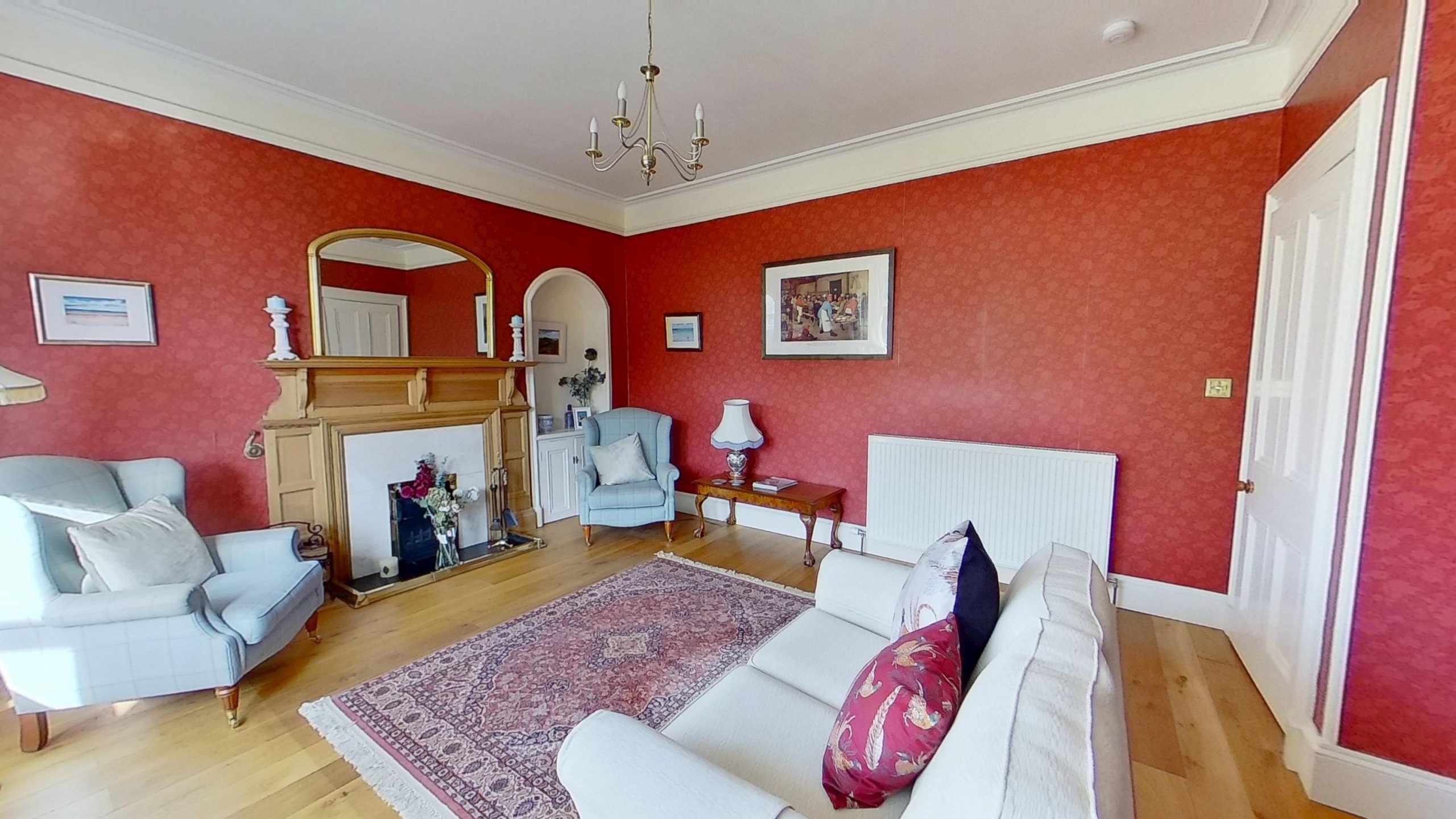 Opposite, the elegant dining room can easily accommodate a large table and furniture, and features a stunning fire surround housing an open fireplace creating warmth and charm to the space. On the ground floor, you’ll also find a comfortable sitting room, complete with its own open fire, and a study perfect for those working from home.. The rear hallway includes a cloakroom with WC and wash hand basin, with the charming antique servant bells, adding a delightful historical touch.