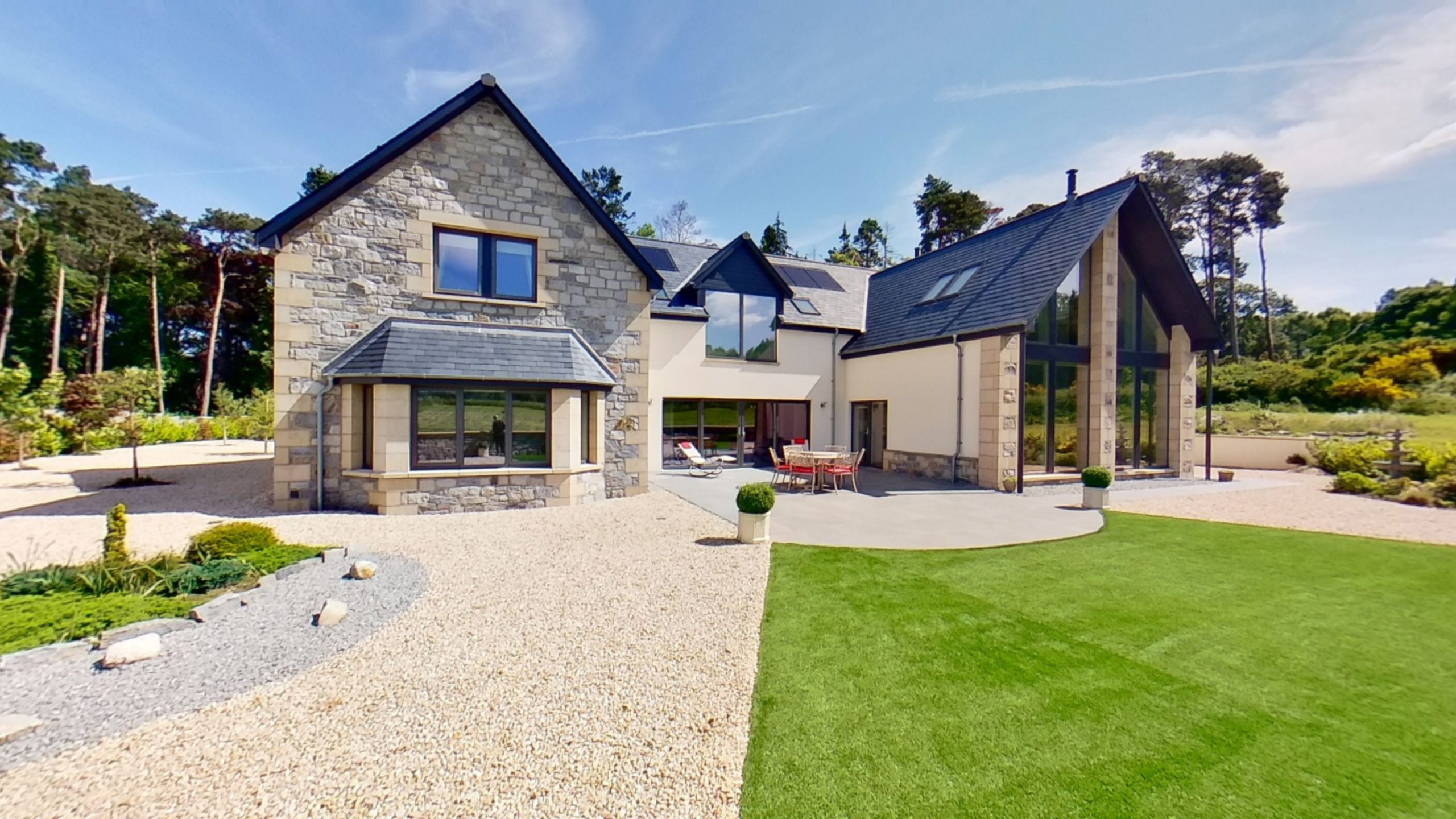 The ultimate lifestyle house in the North of Scotland, Thistle House combines virtually everything that one could want in a home; space, privacy, easy access to transport, clean air, safety, lovely vistas over fields and woodland with big skies, packaged in an energy efficient house, built to a high specification with outstanding, spacious living accommodation on a substantial area of land. The utmost attention has been paid to each and every aspect of this house, from construction materials through to the quality of the finishes.Thistle House has been designed and built to standards rarely seen in the UK. Built towards Passivhaus standards, Thistle House was completed in 2021. Core to the construction of this 512m2 home was to create a house that was robust, environmentally friendly, low maintenance and yet offering the highest quality possible in both finishings and construction. It is extremely rare for a house of this size to achieve a construction EPC of A. Sitting in approximately 2.9 acres of manicured gardens and paddock, Thistle House offers substantial indoor and outdoor living spaces.