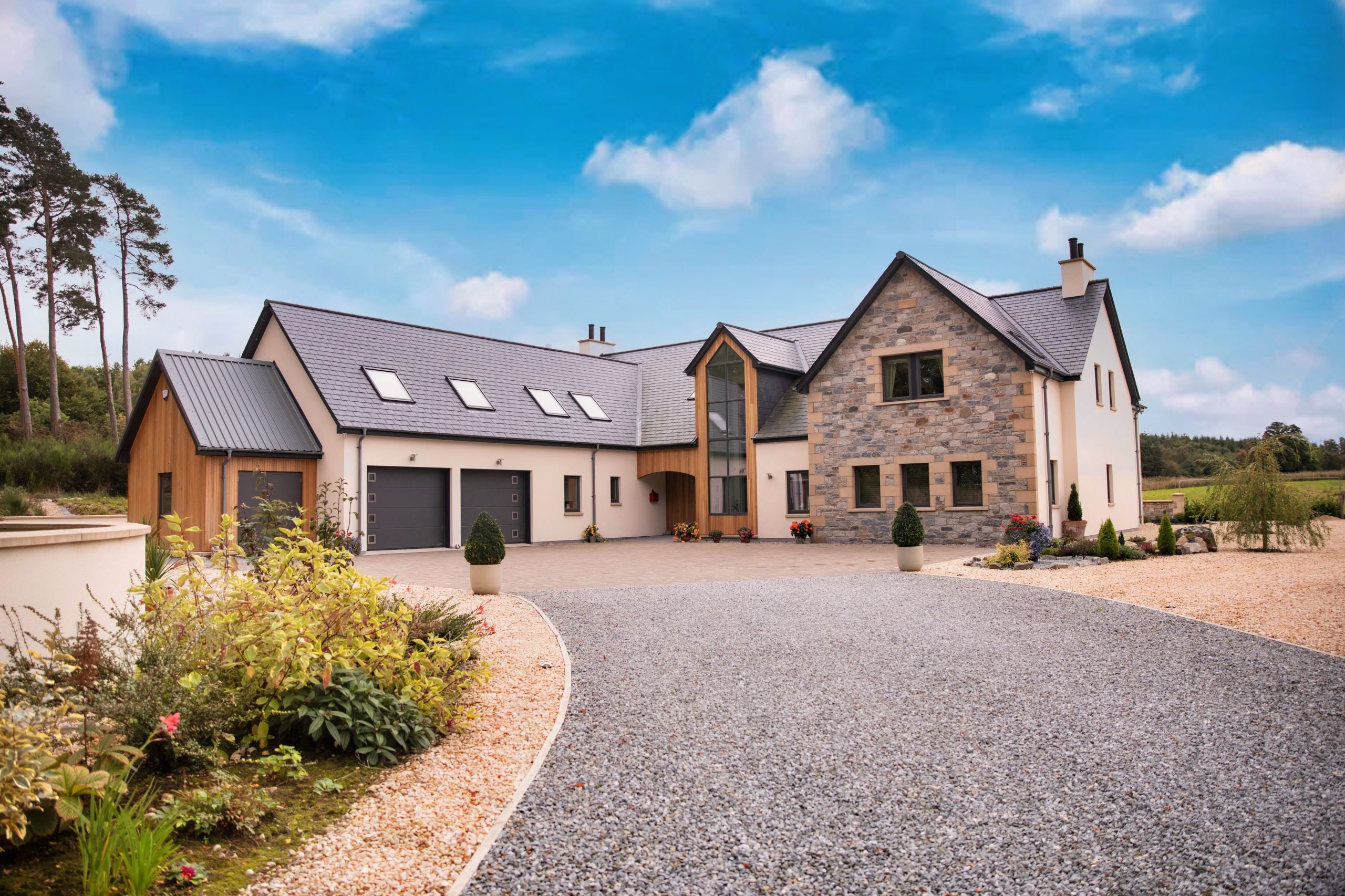 First floor: stunning open plan living space, three spacious ensuite bedrooms, substantial office/games room, plant room.